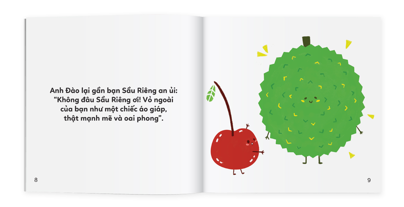 - Mỗi một loại trái cây lại có một đặc điểm riêng biệt: Quả thì gai góc, quà thì sần sùi,... nhưng chúng đều có một vẻ đẹp và hương vị rất riêng, không dễ bị trộn lẫn. "Trái nào cũng đẹp" sẽ giúp bé hình thành đức tính tự tin.