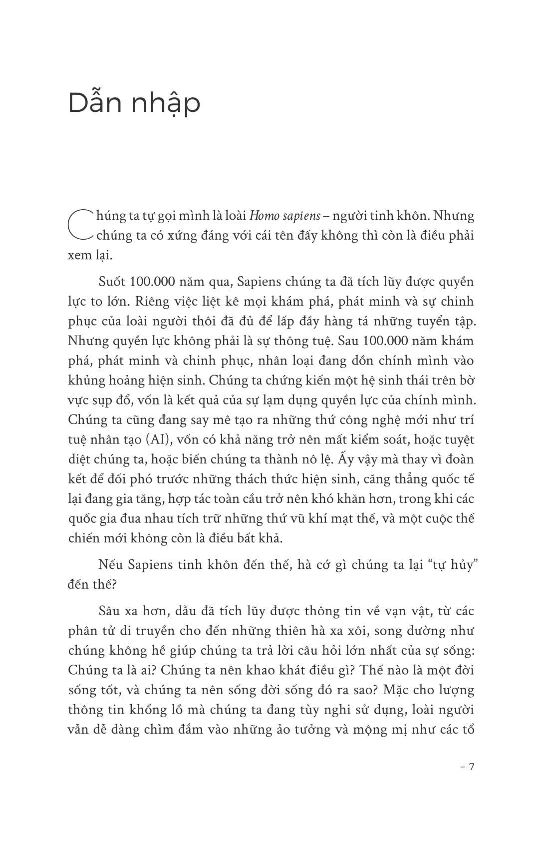 Trong 100.000 năm qua, loài Sapiens đã tích lũy được sức mạnh to lớn. Song bất chấp mọi khám phá, phát minh và chinh phục, giờ đây chúng ta thấy m.ình đang ở trong một cuộc khủng hoảng hiện sinh. Thế giới đang trên bờ vực sụp đổ sinh thái. Căng thẳng chính trị đang gia tăng. Thông tin sai lệch tràn lan. Và chúng ta đang bước vào kỷ nguyên của AI – một mạng lưới thông tin hoàn toàn mới.