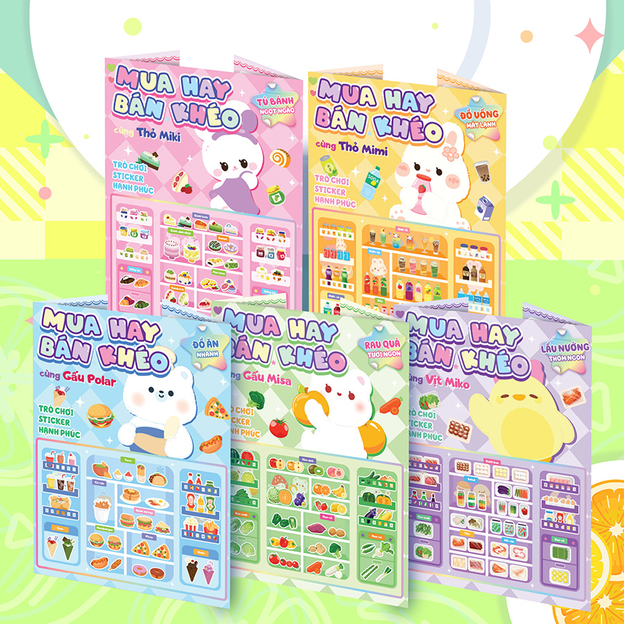 Mua hay bán khéo gồm 5 tập khác nhau với gian hàng khác nhau cùng các bạn Gấu, Thỏ, Vịt. Mỗi tập bao gồm 60+ stickers an toàn và siêu đáng yêu. 5 tập này sẽ là người bạn đồng hành tuyệt vời cho sự sáng tạo và trí tưởng tượng của các bé.