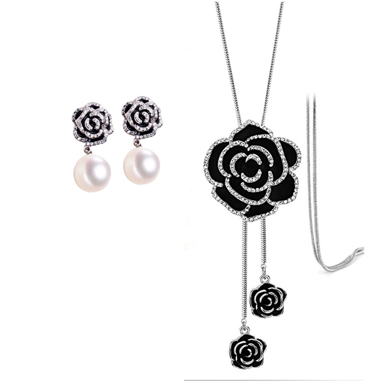 Set sản phẩm gồm 1 đôi bông tai và 1 dây chuyền hoa hồng đen