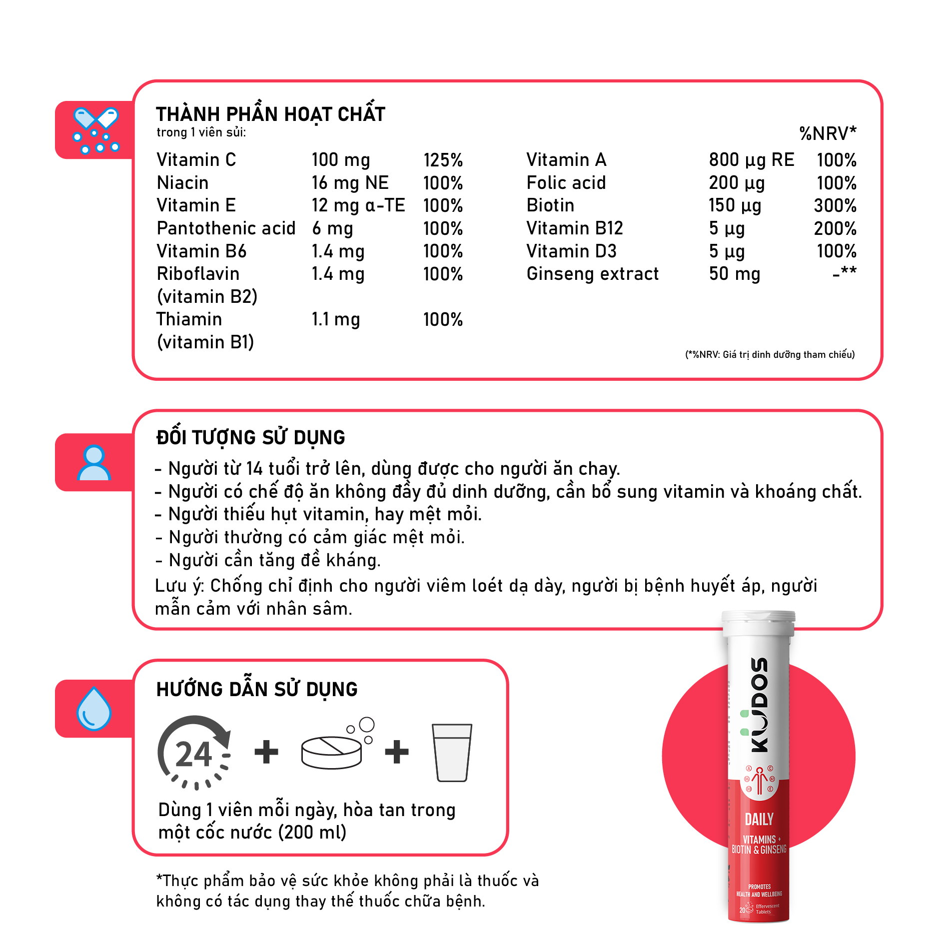 - KUDOS DAILY Trong mỗi viên sủi 4 g chứa: Vitamin C (Acid L-ascorbic) 100 mg, Chiết xuất nhân sâm 50 mg, Niacin (Nicotinamid) 16 mg NE, Vitamin E (DL-alpha-tocopheryl acetat) 12 mg α-TE, Acid pantothenic (D-pantothenat, calci) 6 mg, Vitamin B2 (Natri riboflavin 5’-phosphat) 1,4 mg, Vitamin B6 (Pyridoxin hydroclorid) 1,4 mg, Vitamin B1 (Thiamin mononitrat) 1,1 mg, Vitamin A (Retinylacetat) 800 µg RE, Acid folic (Acid pteroymonoglutamic) 200 µg, Biotin (D-Biotin) 150 µg, Vitamin D3 (Cholecalciferol) 5 µg, Vitamin B12 (Cyanocobalamin) 5 µg. Phụ liệu: Chất điều chỉnh độ acid: acid citric, natri hydro carbonat; chất độn: sorbitol; hương liệu tổng hợp (hương cam); chất tạo ngọt tổng hợp: aspartam; chất độn: maltodextrin, bột nước ép củ dền; chất tạo ngọt tổng hợp: acesulfam kali. Chú ý: • Thực phẩm này không phải là thuốc, không có tác dụng thay thế thuốc chữa bệnh. • Không dùng cho người mẫn cảm, kiêng kỵ với bất cứ thành phần nào của sản phẩm. • Phụ nữ có thai, đang cho con bú, người bị viêm loét dạ dày, tá tràng, nên tham khảo ý kiến bác sĩ, chuyên gia y tế trước khi dùng. • Không dùng quá liều khuyến nghị hàng ngày. • Không phù hợp cho trẻ em dưới 14 tuổi. Để xa tầm tay trẻ nhỏ. • Không dùng sản phẩm sau ngày hết hạn. • Sản phẩm là thực phẩm bảo vệ sức khỏe chứa vitamin, khoáng chất và chất tạo ngọt. • Thực phẩm bảo vệ sức khỏe không thay thế cho chế độ ăn uống đa dạng cân bằng và lối sống lành mạnh. • Sản phẩm không chứa lactose, gluten và thân thiện với người ăn chay. Thời hạn sử dụng: 36 tháng kể từ ngày sản xuất NSX, HSD: Xem “MFD” và “EXP” ở đáy tuýp. Xuất xứ: Đức