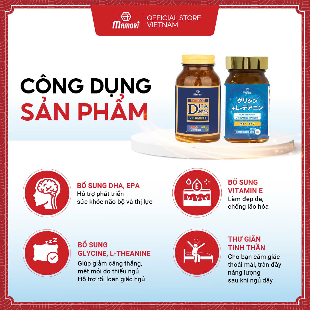 Combo viên uống MAMORI DHA - EPA và Glycine L-theanine là giải pháp hoàn hảo để chăm sóc giấc ngủ và phát triển trí tuệ. Viên uống DHA - EPA từ Nhật Bản hỗ trợ