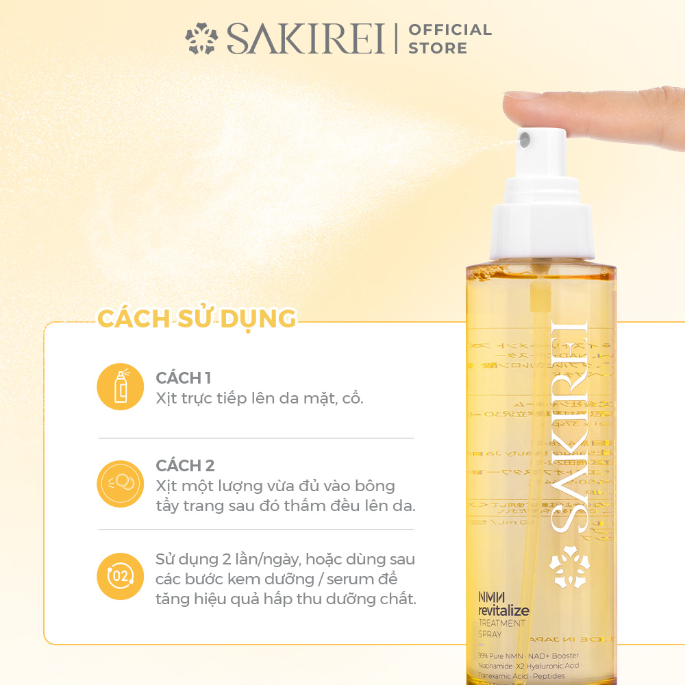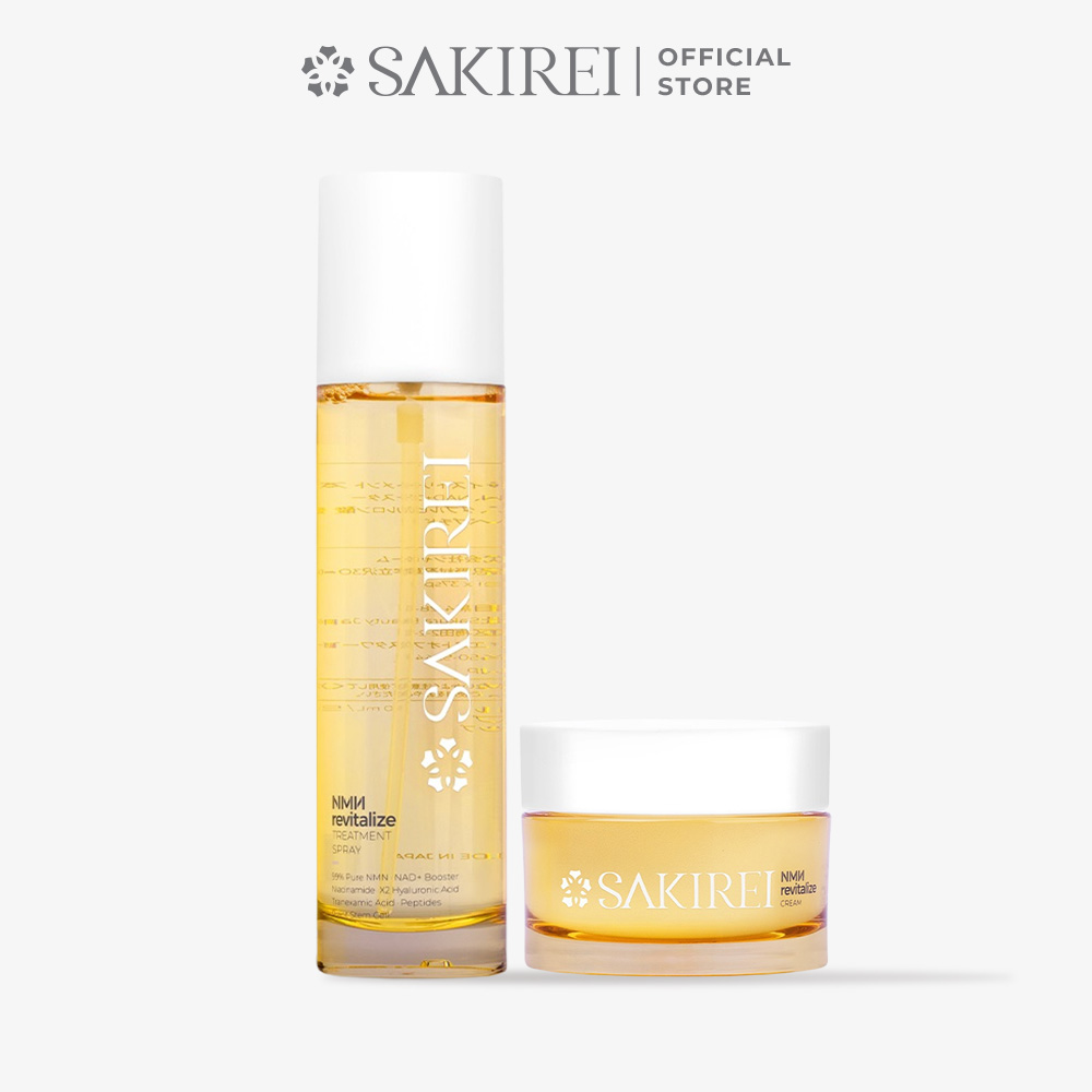 COMBO XỊT NMN, HA SAKIREI & KEM DƯỠNG PHỤC HỒI DA SAKIREI NMN REVITALIZE TỪ NHẬT BẢN ---------------------------------------------------------------------- XỊT NMN & HA CHỐNG LÃO HÓA, CẤP ẨM, PHỤC HỒI TẾ BÀO DA Sakirei NMN Revitalize Treatment Spray Sản phẩm Sakirei NMN Revitalize Treatment Spray có khả năng cấp ẩm vượt trội nhờ ứng dụng công nghệ bào chế Hyaluronic Acid, trong đó, Hyaloveil-P có khả năng lưu giữ trên da cao gấp 17 lần HA thông thường. > CÔNG DỤNG • Phức hợp NMN, HA, Niacinamide cùng tế bào gốc thực vật giúp khôi phục sự cân bằng giữa các lớp lipid và lớp nước, tăng khả năng giữ ẩm cho da • Phục hồi da, hỗ trợ giảm lão hóa trên da • Giảm tình trạng khô da • Cải thiện độ đàn hồi, săn chắc, giảm thiểu nếp nhăn và làm căng bóng da • Hạn chế tình trạng tăng sắc tố da, ngăn sự tích tụ melanin giúp sáng da • Chống oxy hóa và bảo vệ da trước tác động tia UV và môi trường ---------------------------------------------------------------------- KEM TẾ DƯỠNG DA NMN Sakirei NMN Revitalize Cream Sakirei NMN Revitalize Cream với công thức chứa phức hợP NMN, tế bào thực vật, Tranexamic Acid, Niacinamide,... có tác dụng dưỡng da toàn diện như cấp ẩm, dưỡng sáng, giảm thâm sạm, khắc phục các dấu hiệu lão hóa. > CÔNG DỤNG • Phức hợp NMN, tế bào gốc thực vật, Niacinamide giúp cấp ẩm phục hồi tổn thương DNA, tăng cường cơ chế tăng sinh tế bào mới • Làm sáng, giảm nám, thâm sạm loại bỏ sắc tố, ngăn sự tích tụ melanin • cải thiện độ đàn hồi và tăng độ ẩm cho da, chống sự mất nước qua biểu bì • Tái tạo và phục hồi lượng nước tự nhiên, tạo thành mạng lưới giữ nước bên dưới da • Làm giảm thiểu nếp nhăn nông và sâu giúp da căng bóng, săn chắc • Làm dịu da > ĐỐI TƯỢNG SỬ DỤNG Sử dụng cho mọi loại da. > HƯỚNG DẪN BẢO QUẢN • Bảo quản sản phẩm ở nơi khô ráo, thoáng mát. • Tránh nơi có nhiệt độ cao và ánh nắng trực tiếp. > VỀ THƯƠNG HIỆU Sakirei là thương hiệu đến từ Nhật Bản chuyên cung cấp các giải pháp trẻ khỏe toàn diện từ trong ra ngoài bằng các sản phẩm thực phẩm bảo vệ sức khỏe và dược mỹ phẩm chăm sóc sắc đẹp. Thương hiệu tập trung khai thác tối ưu hiệu quả NMN - hoạt chất nằm trong công trình nghiên cứu mang tính thành tựu của nhân loại với khả năng đảo ngược lão hóa, kéo dài tuổi thọ. Ngoài ra, trong công thức điều chế các sản phẩm của Sakirei, đội ngũ chuyên gia hàng đầu thế giới kết hợp đồng thời các thành phần, hoạt chất ưu việt và ứng dụng công nghệ khoa học hiện đại nhằm đáp ứng các nhu cầu và tình trạng khác nhau của khách hàng.