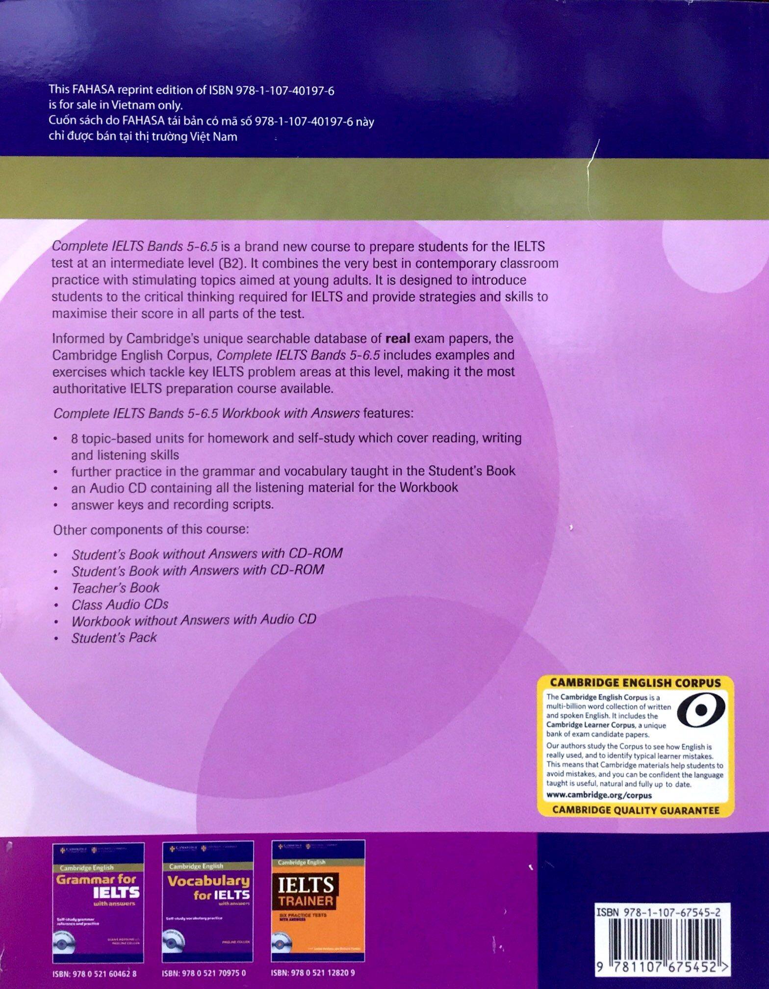 Complete IELTS combines the very best in contemporary classroom practice with stimulating topics aimed at young adults wanting to study at university. Complete IELTS Bands 4-5 prepares students for the IELTS test at B1 (foundation level). It is designed to introduce students to the critical thinking required for IELTS and provide strategies and skills to maximise their score. The information, practice and advice contained in the course ensure that they are fully prepared for all parts of the test. The Workbook with Answers with Audio CD features reading, writing and listening exercises with answer key for homework. It provides further practice in the Student's Book grammar and vocabulary and contains an Audio CD and recording scripts for the Workbook .