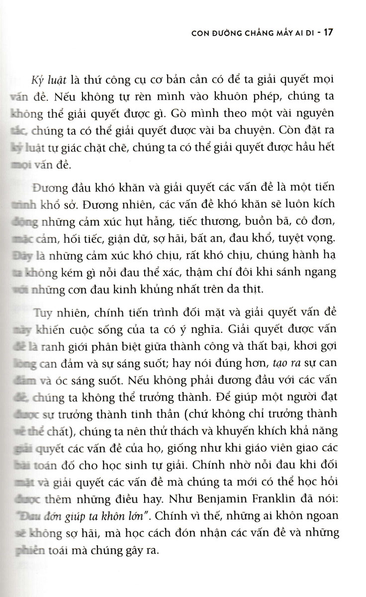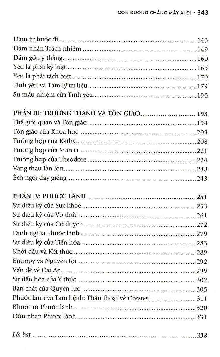 Với cách hành văn kinh điển và thông điệp đầy thấu hiểu, quyển sách Con Đường Chẳng Mấy Ai Đi giúp chúng ta khám phá bản chất của các mối quan hệ và của một tinh thần trưởng thành. Quyển sách giúp chúng ta học cách phân biệt sự lệ thuộc với tình yêu; làm thế nào để trở thành những bậc phụ huynh tinh tế và nhạy cảm; và cuối cùng là làm thế nào để sống chân thật với chính mình.