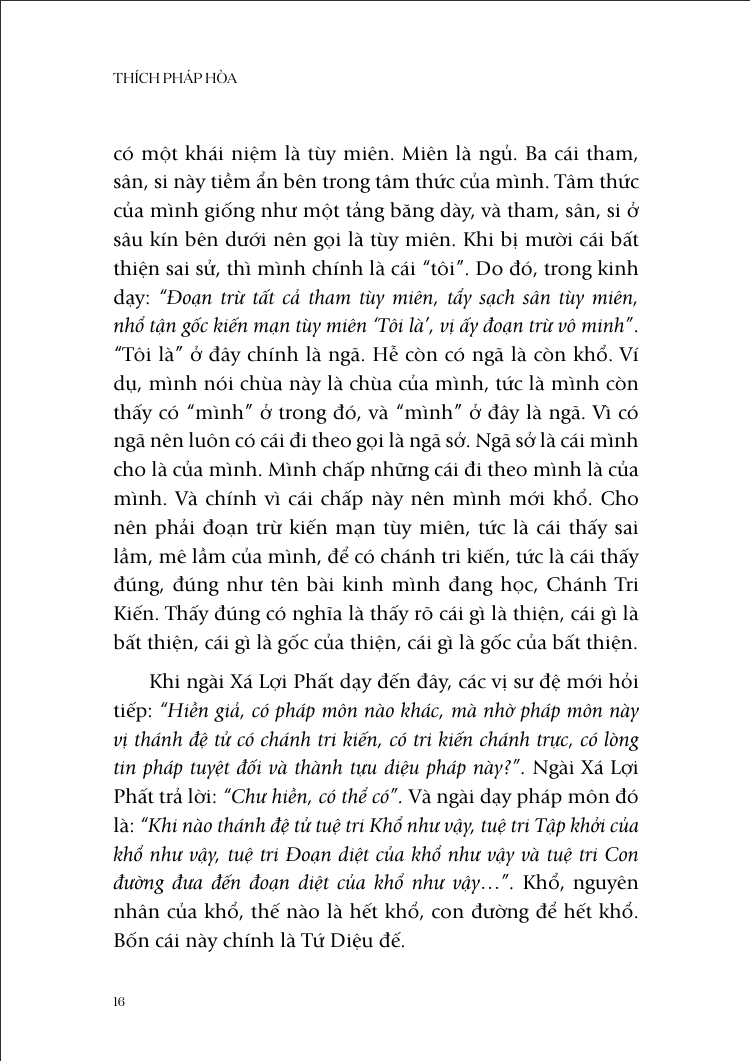 Trong quyển sách này, quý độc giả yêu mến thầy Thích Pháp Hòa qua những bài giảng của thầy trên YouTube và cả những độc giả muốn tìm hiểu sâu hơn về giáo lý của đức Phật có cơ hội tiếp cận với Phật pháp ở một góc nhìn chân phương, giản dị và khá đầy đủ thông qua những ví dụ và câu chuyện đời thường của thầy. Nhờ đó, những khái niệm thâm sâu nhưng vô cùng thiết yếu của giáo lý nhà Phật trở nên gần gũi và có khả năng ứng dụng được. Trong khi ngôn ngữ của giáo lý thường là rào cản thì những câu chuyện vui, những ví dụ gần với đời thường của thầy Thích Pháp Hòa lại có khả năng mang chúng ta đến gần hơn với các pháp môn tu tập, từ đó giúp chúng ta tìm thấy con đường an lạc và giải thoát cho chính mình.
