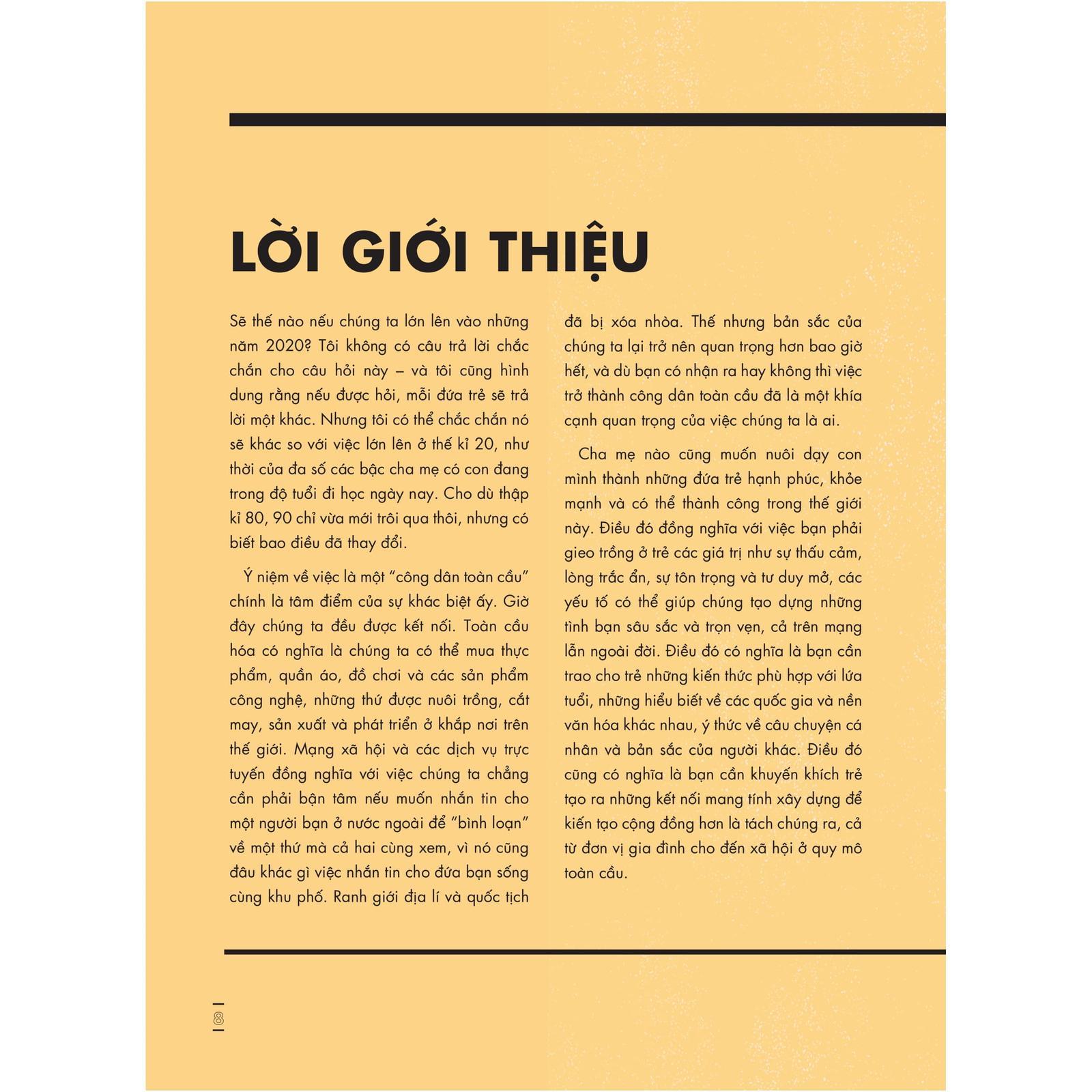 Khái niệm “công dân toàn cầu” giờ đây sẽ không còn quá chung chung và mơ hồ nữa. Với cuốn sách này, các bậc cha mẹ, thầy cô và người chăm sóc trẻ sẽ có một hình dung đầy đủ hơn về những phẩm chất cần có của một công dân toàn cầu cũng như những điều họ nên làm và có thể làm để giúp trẻ có được các phẩm chất ấy.