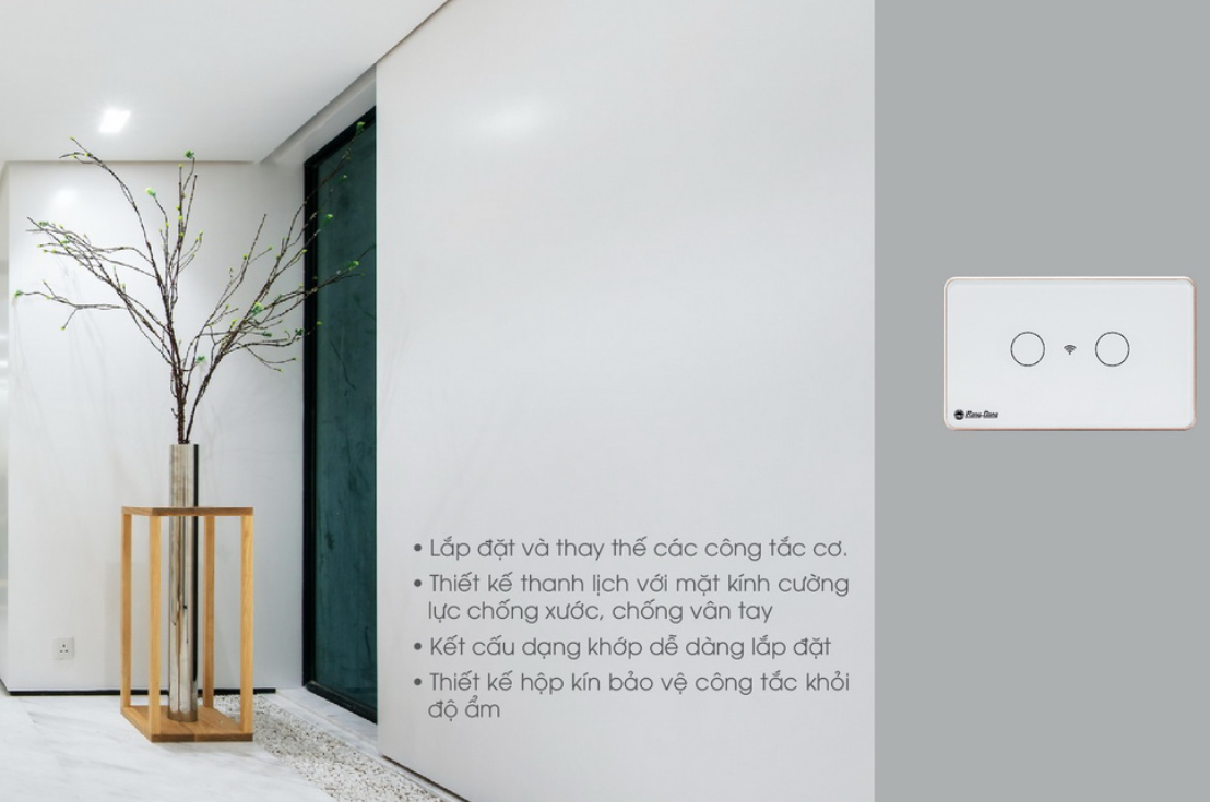 Công tắc cảm ứng bật/tắt 1 thiết bị. Sử dụng công nghệ cảm ứng điện dung, đặc biệt với khả năng hỗ trợ điều khiển các thiết bị qua WiFi cho phép bật/tắt, hẹn giờ,