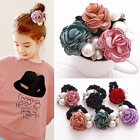 Dây cột tóc hoa hồng vải voan, phụ kiện tóc hoa hồng nữ tính, thun buộc tóc đính nơ trắng đáng yêu p