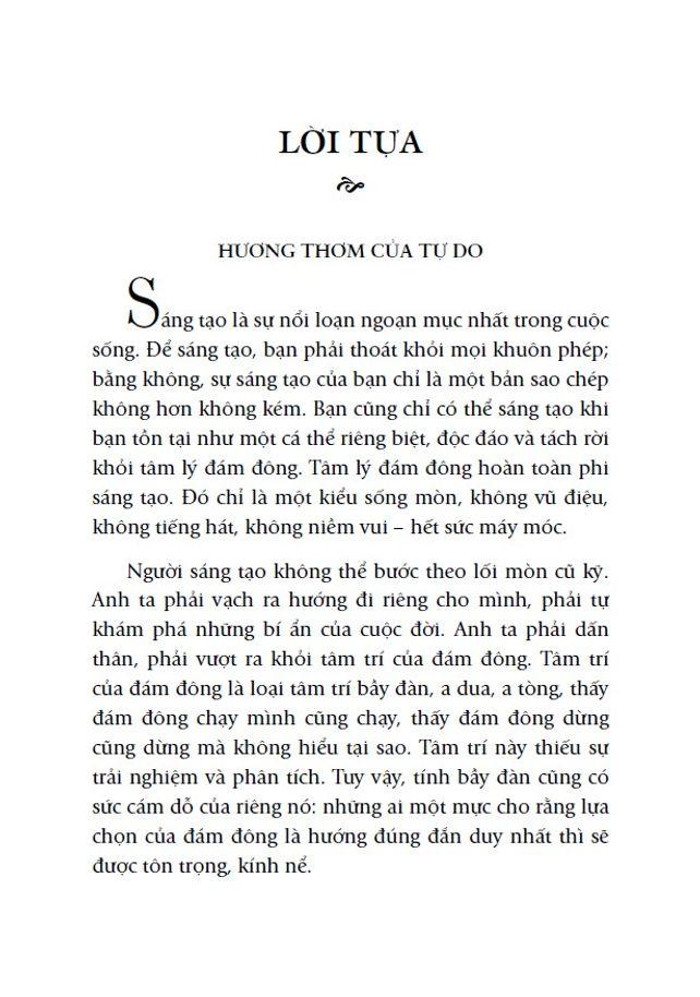 Creativity - Sáng Tạo - Bừng Cháy Sức Mạnh Bên Trong Bạn đọc Việt Nam đã yêu thích với quyển sách Hạnh Phúc Tại Tâm (JOY: The Happiness That Comes from Within) của tác gia Osho do First News xuất bảnvà đánh giá rất cao. Không chỉ vậy, quyển sách còn trở thành người bạn đồng hành trong cuộc sống. Và giờ đây, bạn đọc chắc chắn sẽ tìm được nhiều cảm hứng với quyển sách Sáng Tạo – Bừng Cháy Sức Mạnh Bên Trong (Creaty Unleashing The Fores Within). Trong đời sống hiện đại, ai cũng cần có khả năng đáp ứng một cách sáng tạo trước những thử thách mới. Những ai chỉ biết đối diện với cuộc đời bằng những gì đã học trong quá khứ thì sẽ bị thiệt thòi ghê gớm trong các mối quan hệ lẫn trong sự nghiệp của m.ình. Để chuyển từ thái độ sống bắt chước và bị gò bó bởi các nguyên tắc sang lối sống sáng tạo và linh hoạt, chúng ta cần phải thay đổi sâu sắc thái độ của chúng ta về bản thân và về khả năng của chính m.ình. Sáng tạo là sự nổi loạn ngoạn mục nhất trong cuộc sống. Để sáng tạo, bạn phải thoát khỏi mọi khuôn phép; bằng không, sự sáng tạo của bạn chỉ là một bản sao chép không hơn không kém. Bạn cũng chỉ có thể sáng tạo khi bạn tồn tại như một cá thể riêng biệt, độc đáo và tách rời khỏi tâm lý đám đông. Người sáng tạo không thể bước theo lối mòn cũ kỹ. Anh ta phải vạch ra hướng đi riêng cho m.ình, phải tự khám phá những bí ẩn của cuộc đời. Anh ta phải dấn thân, phải vượt ra khỏi tâm trí của đám đông. Tâm lý đám đông cũng có sức cám dỗ của riêng nó: những ai một mực cho rằng lựa chọn của đám đông là hướng đúng đắn duy nhất thì sẽ được tôn trọng, kính nể. Sáng Tạo – Bừng Cháy Sức Mạnh Bên Trong sẽ dẫn dắt bạn đi vào thế giới của sự sáng tạo từ những bước chuẩn bị ban đầu, đến những trở ngại, khó khăn, những thắc mắc và cuối cùng không gì khác hơn là sự sáng tạo. Ở đó, bạn nhận thấy ý nghĩa cuộc sống là một vũ điệu chứ không phải một tảng đá trước mặt. Nó cũng chính là âm nhạc. Và bạn là người tạo ra nó chứ không phải là tìm thấy nó. Nhà triết học hiện đại Osho, thiền sư Osho, đạo sư Osho, luận sư Osho, nhà sáng tạo Osho, hay đơn giản là… Osho, đã không ngừng nói cho người nghe cùng thời và người đọc của mọi thời về bản chất của cuộc sống. Suốt 35 năm, tư tưởng của ông bay khắp mọi nơi trên thế giới bằng con đường truyền bá của những môn đệ thầm lặng, bất chấp những đánh giá khắt khe và đầy “hoang mang” về tinh thần triết học mãnh liệt của ông. Tác phẩm Sáng Tạo – Bừng Cháy Sức Mạnh Bên Trong cũng là một trong số những tâm tình thánh thiện đó.