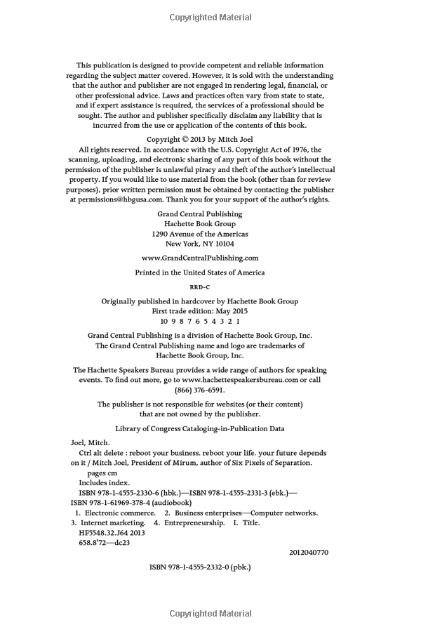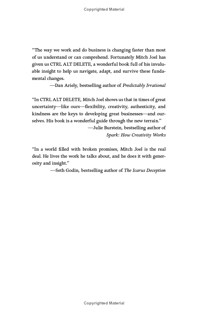 Mitch Joel, one of the world's leading experts in new media, warns that the time has come to CTRL ALT DELETE. To reboot and to start re-building your business model. If you don't, Joel warns, not only will your company begin to slide backwards, but you may find yourself unemployable within five years.