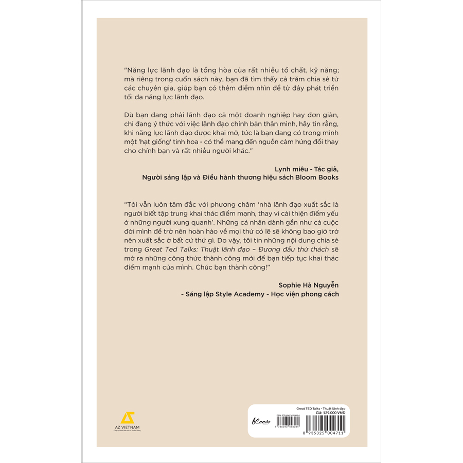 Great TED Talks: Thuật lãnh đạo – Đương đầu thử thách là một cuốn sách đặc biệt về đề tài LÃNH ĐẠO. Thông qua 100 bài chia sẻ trên sân khấu TED về chủ đề này, độc giả sẽ có cái nhìn đa chiều và toàn diện hơn về lãnh đạo. Lãnh đạo không chỉ xuất hiện ở nơi làm việc hay ám chỉ năng lực tạo ảnh hưởng lên người khác mà còn được bộc lộ ở mọi mặt trong đời sống. Những câu chuyện trong sách giúp người đọc nhìn nhận những khía cạnh và tố chất khác nhau của một nhà lãnh đạo. Và mặc dù không phải người làm lãnh đạo nào cũng hội tụ đầy đủ những phẩm chất này, cuốn sách vẫn cho chúng ta hy vọng vào một thế hệ lãnh đạo mới trong tương lai. Qua đây, tác giả Harriet Minter cũng mong muốn bạn đọc sẽ có thêm cảm hứng, linh hoạt trong cách nhìn nhận và điều chỉnh phong cách lãnh đạo của bản thân.