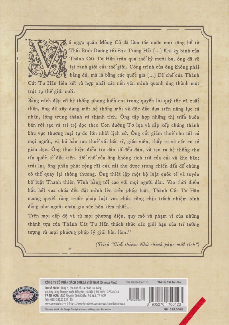 Tuy nhiên, câu chuyện về Thành Cát Tư Hãn và đế chế của ông rất thú vị và đáng để kể lại. Từ thời thơ ấu gian khó của Thành Cát Tư Hãn đến quá trình xây dựng đế chế thương mại đầu tiên, cho đến sự kết nối chặt chẽ với các lục địa châu Âu và châu Á, quyển sách Thành Cát Tư Hãn Và Sự Hình Thành Thế Giới Hiện Đại sẽ kể lại câu chuyện có thật về vị hoàng đế này .