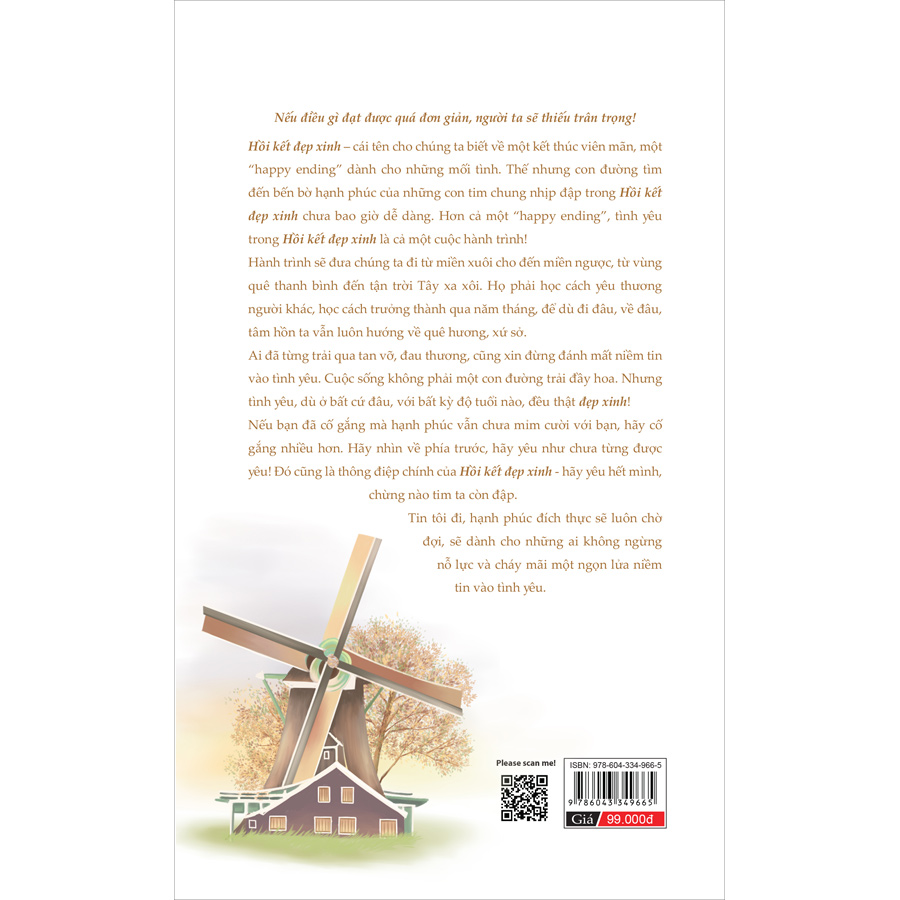 “Hồi kết đẹp xinh” – cái tên cho chúng ta biết về một kết thúc viên mãn, một “happy ending” dành cho những mối tình. Thế nhưng con đường tìm đến bến bờ hạnh phúc của những con tim chung nhịp đập trong “Hồi kết đẹp xinh” chưa bao giờ dễ dàng. Hơn cả một “happy ending”, tình yêu trong “Hồi kết đẹp xinh” là cả một cuộc hành trình! Hành trình sẽ đưa ta đi từ miền xuôi cho đến miền ngược, từ vùng quê thanh bình đến tận trời Tây xa xôi. Họ phải học cách yêu thương người khác, học cách trưởng thành qua năm tháng, để dù đi đâu, về đâu, tâm hồn ta vẫn luôn hướng về quê hương, xứ sở. Ai đã từng trải qua tan vỡ, đau thương, cũng xin đừng đánh mất niềm tin vào tình yêu. Cuộc sống không phải một con đường trải đầy hoa. Nhưng tình yêu, dù ở bất cứ đâu, với bất kỳ độ tuổi nào, đều thật “đẹp xinh”! Nếu bạn đã cố gắng mà hạnh phúc vẫn chưa mỉm cười với bạn, hãy cố gắng nhiều hơn. Hãy nhìn về phía trước, hãy yêu như chưa từng được yêu! Đó cũng là thông điệp chính của “Hồi kết đẹp xinh” – hãy yêu hết mình, chừng nào con tim ta còn đập.  Tin tôi đi, hạnh phúc địch thực sẽ luôn chờ đợi, sẽ dành cho những ai không ngừng nỗ lực và cháy mãi một ngọn lửa niềm tin vào tình yêu. TÓM TẮT NỘI DUNG Tập truyện ngắn gồm 7 câu chuyện khác nhau xoay quanh tình yêu, tình bạn và tình cảm gia đình. Câu chuyện thứ nhất, “Những chú chim non lạc đàn”, lấy bối cảnh của đất nước Hà Lan với những cối xay gió kết hợp cả tình người nơi quê nhà chân thật. Truyện kể về hành trình vượt qua những khó khăn trong cuộc sống, bằng tình yêu và nghị lực, những nhân vật chính đã vươn lên và trở thành người có ích cho xã hội. Câu chuyện thứ hai, “Gửi mùa thu ở lại”, vẽ ra một Hội An đầy thơ mộng, thân thuộc; một Paris rất tình; một nước Đức rộng lớn và cả hành trình vượt qua những ám ảnh của quá khứ để tìm lại tình yêu của một gia đình nhỏ. Câu chuyện thứ ba, “Chiếc kẹp tóc bên bờ thành cổ”, nói về tình cảm mãnh liệt bao năm không đổi của chàng trai dành cho cô gái. Cuối cùng, họ đã đến với nhau sau bao xa cách. Câu chuyện thấm đượm tình người đất Quảng Trị đầy nắng gió. “Anh chỉ yêu mình em” mang hơi hướng của cuộc sống gia đình. Mặc dù thất bại trong hôn nhân, song nhân vật nữ chính cuối cùng cũng tìm được hạnh phúc thực sự của mình. Câu chuyện thứ năm, “Quảng trường ngủ quên”, nói về nỗ lực chữa bệnh cho con của người phụ nữ góa chồng. Câu chuyện thấm đượm tình người giữa một Paris phồn hoa mà xa xôi, thắp lên ngọn lửa tình yêu từ người mẹ can đảm. “Đường yêu màu đỏ” lấy bối cảnh Chợ Lớn vốn quen thuộc với rất nhiều người. Câu chuyện kể về một cuộc tình tay ba kéo dài rất nhiều năm; cuối cùng, những người yêu nhau đã tìm được lựa chọn cho mình. Câu chuyện cuối cùng, “Hoa tuyết đại ngàn”, là một bức tranh hiện lên trên nền xứ sở hoa anh đào – đất nước Nhật Bản. Cô gái trẻ tên Tuyết bị tật nguyền do một vụ tai nạn, song cô luôn lạc quan, yêu đời. Cuối cùng, Tuyết cũng đã tìm được tình yêu của cuộc đời mình. THÔNG TIN TÁC GIẢ