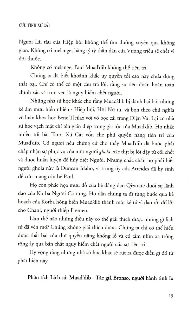 Cứu Tinh Xứ Cát - Dune Phần 2   GIỚI THIỆU SÁCH:   Nhiều năm sau khi trở thành Hoàng đế Xứ Cát và đấng tiên tri của con dân đế quốc liên hành tinh, Paul Muad'dib vẫn chẳng mấy khi có được an bình. Những kẻ thù không đội trời chung vẫn không buông tha chàng. Mưu sâu chước hiểm của chúng luôn luôn đe dọa cướp đi tất cả những gì chàng yêu quý nhất, hòng bẻ gãy tinh thần chàng, buộc chàng phải có những quyết định ngược với các nguyên tắc và lý tưởng chàng hằng theo đuổi. Cứu tinh Xứ Cát dẫn dắt ta theo sát những biến cố mới đầy hiểm nghèo và bi thương đó trong cuộc đời Paul Muad'dib, con người đầy quyền uy lẫn bi kịch, khiến ta vui với những chiến thẳng mới của Cứu tinh Xứ Cát đồng thời đau cùng nỗi đau lớn của chà