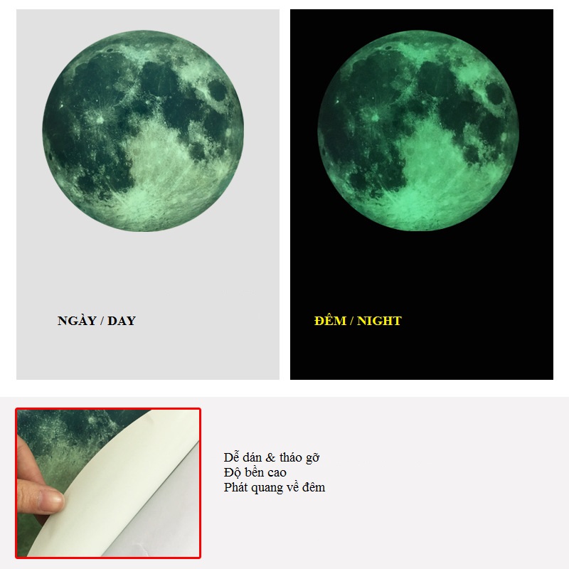 Mặt trăng dạ quang 30 x 30 cm với họa tiết dạ quang nổi trong đêm sẽ mang đến một không gian lung linh cho căn phòng của bạn.Sản phẩm dán được trên nhiều bề