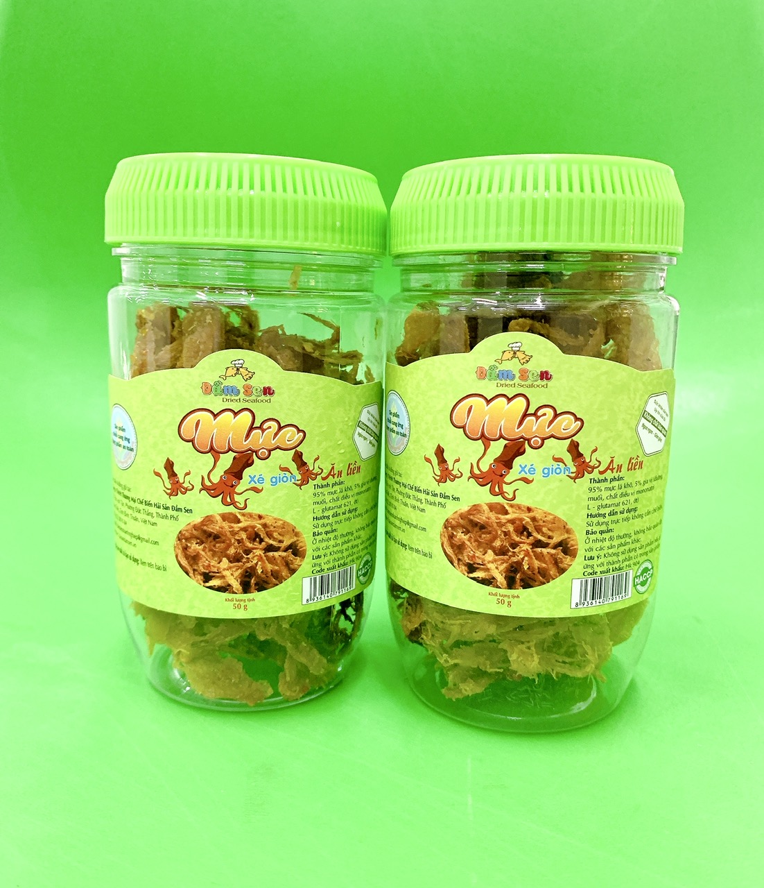 Thành phần: 90% Mực khô xé sợi, 10% gia vị (đường, muối, bột ngọt, ớt) Hạn sử dụng: 12 tháng kể từ ngày sản xuất Hướng dẫn sử dụng: Sử dụng trực tiếp không cần
