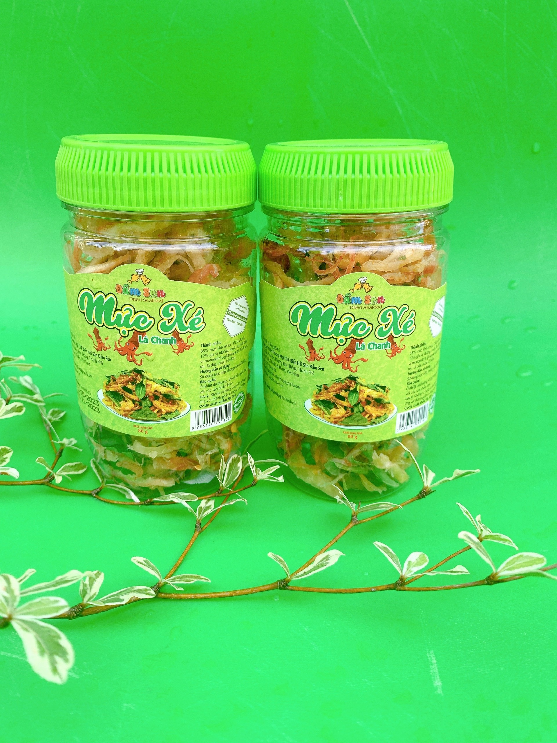 - Mực xé lá chanh hộp 250 gram được chế biến từ mực còn mi nơ tươi xanh tại Cảng cá Phan Thiết tỉnh Bình Thuận. - Mực xé lá chanh được chế biến theo quy