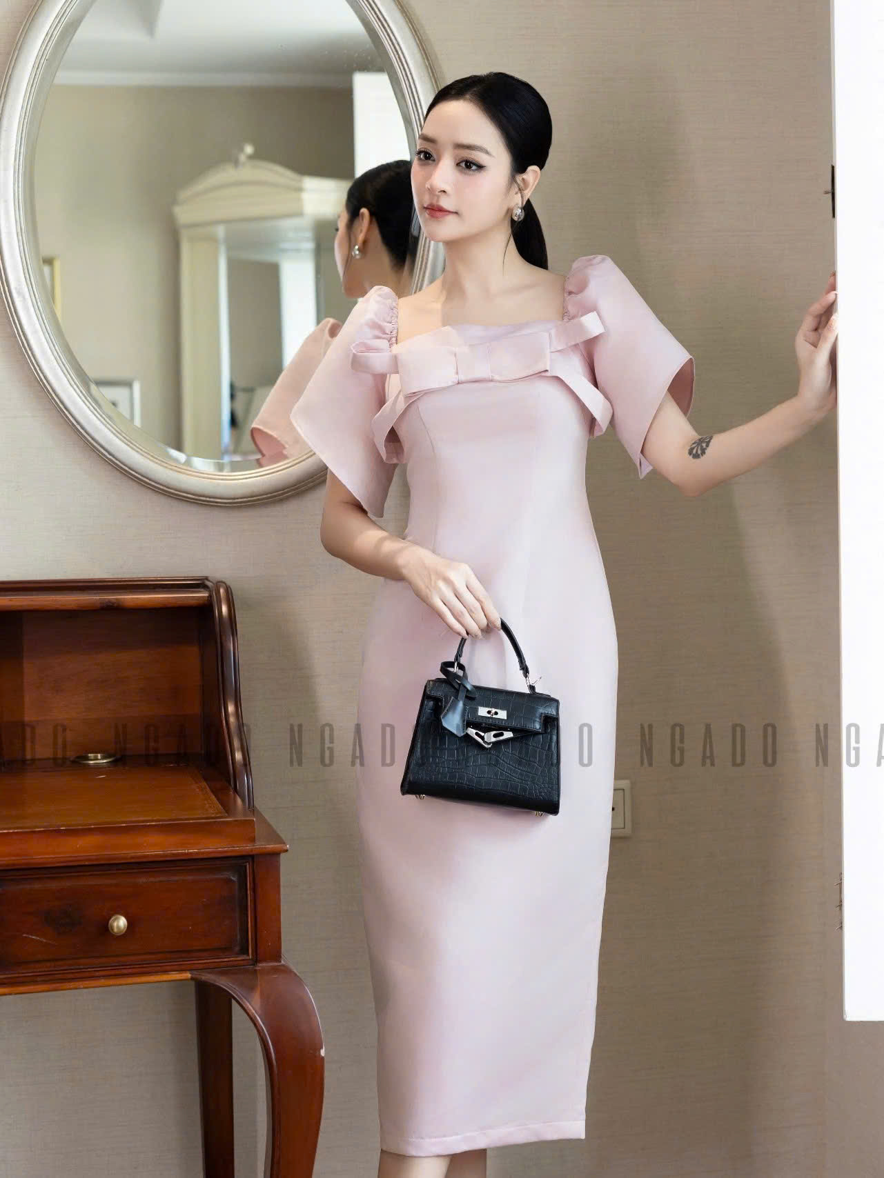 ✨Đầm hồng cổ vuông tay phồng NGADO , đầm dự tiệc , đầm sang trọng