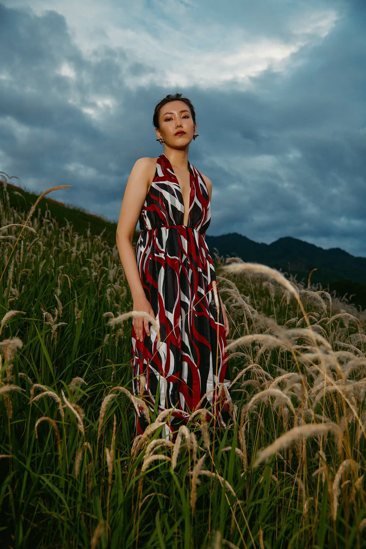Chiếc đầm maxi hở lưng với họa tiết  hình khối lượn sóng mạnh mẽ, trừu tượng đỏ đen trắng tương phản khiến chiếc đầm trở thành một tác phẩm thị giác mạnh mẽ, nơi từng chi tiết đều khẳng định cá tính riêng. Những đường nét xoắn vặn và uốn lượn mềm mại gợi nhịp điệu của vũ điệu, biểu tượng cho dòng chảy không ngừng của cuộc sống, sự linh hoạt và tự do. Phom dáng dài thướt tha được cân bằng bởi đường cắt táo bạo khoe lưng trần, tạo nên một bản tuyên ngôn thời trang đầy quyến lực: vừa gợi cảm với vẻ quyến rũ tiềm ẩn, vừa sang trọng với phong thái tự tin.