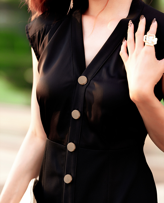 Cài bằng hàng nút đen bọc vàng ánh kim nổi bật phía trước