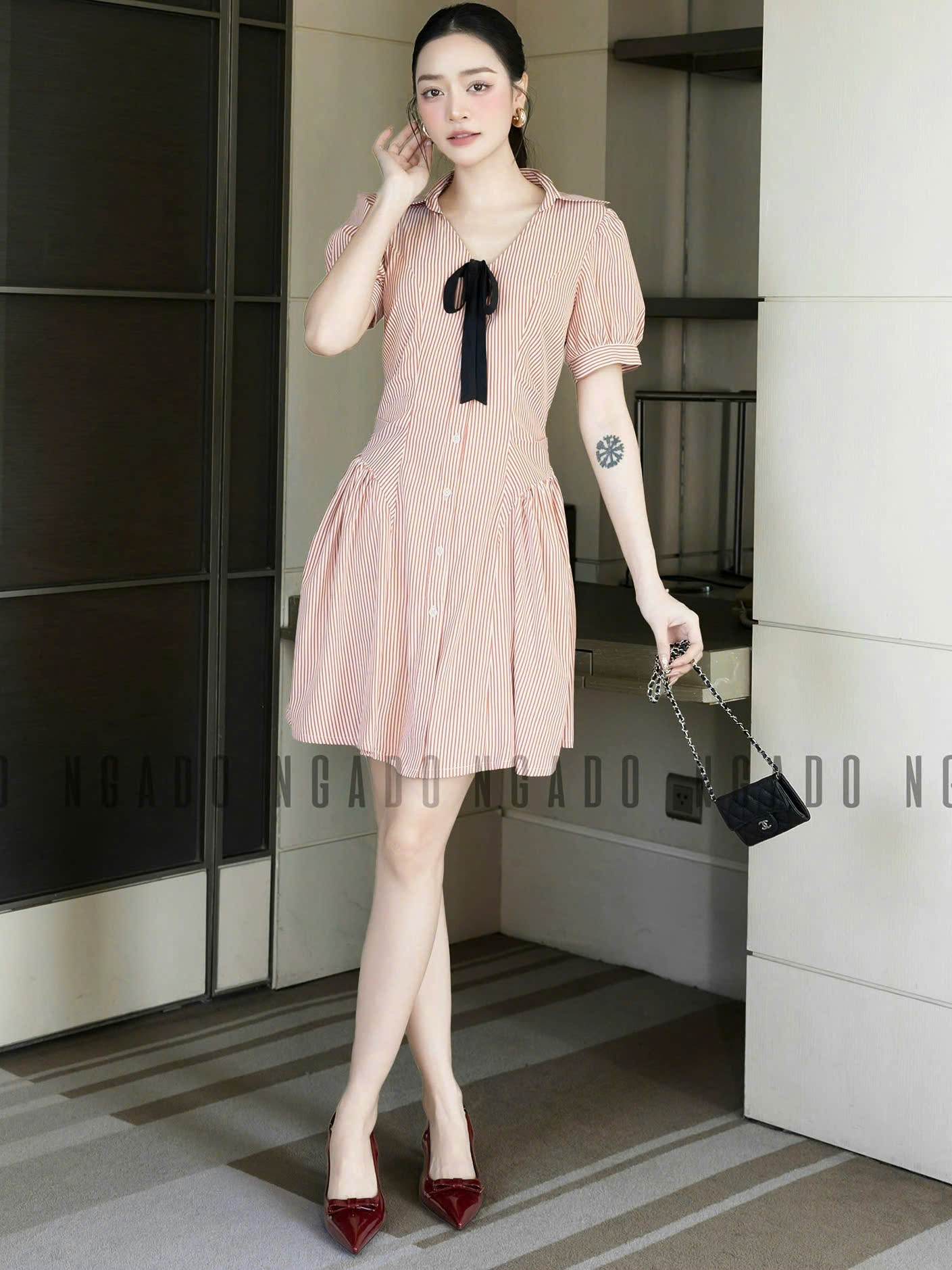 ✨Đầm sọc cam đính nơ NGADO , đầm kiểu Nữ , đầm kẻ sọc