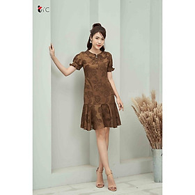 ✨Đầm suông cổ sen đính ngọc, hoa chìm , gấy bèo Tri'C Luxury A24621 Nâu tây