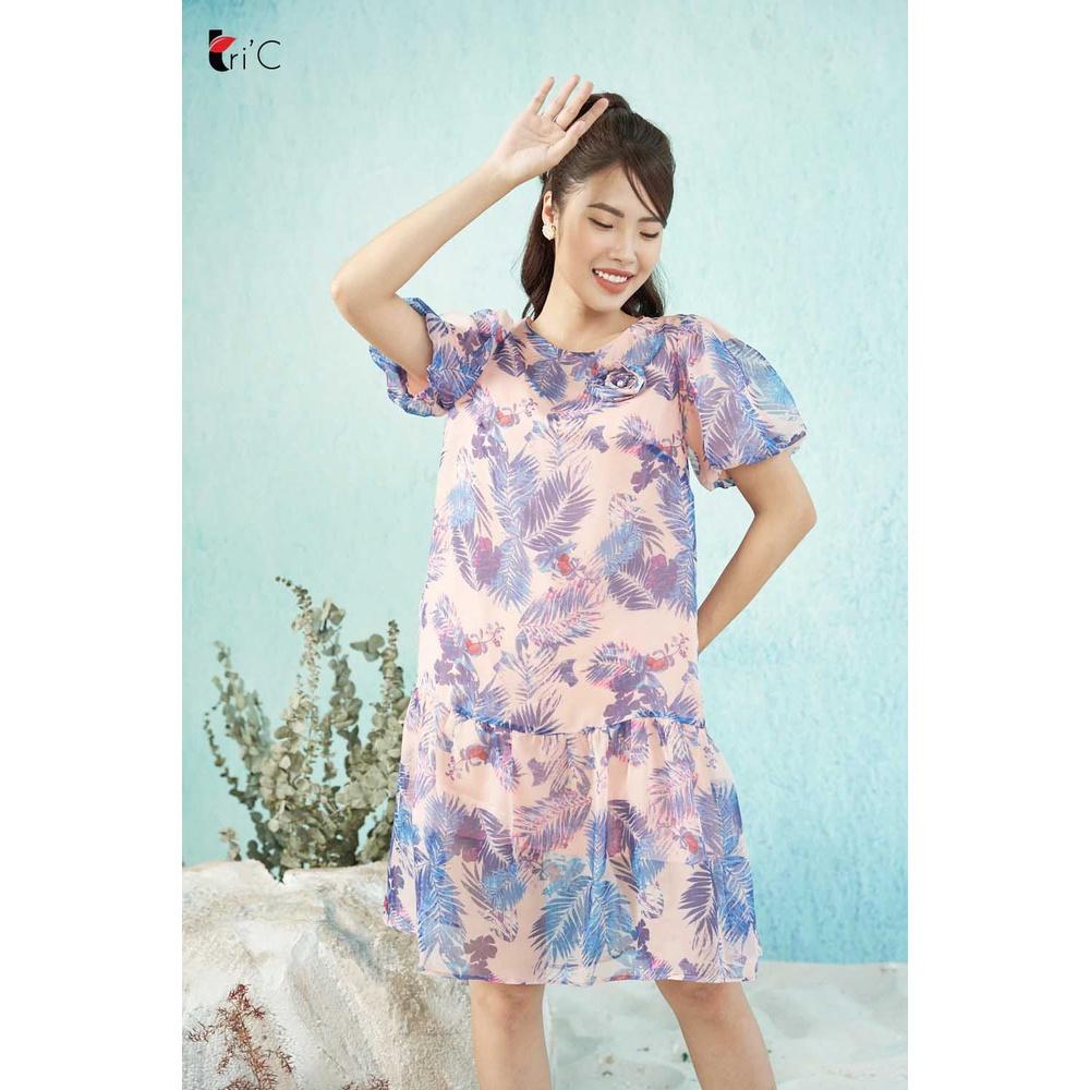 ✨Đầm suông họa tiết Tropical, tay bồng, đính bông Tri'C Luxury A25021 Xanh cam