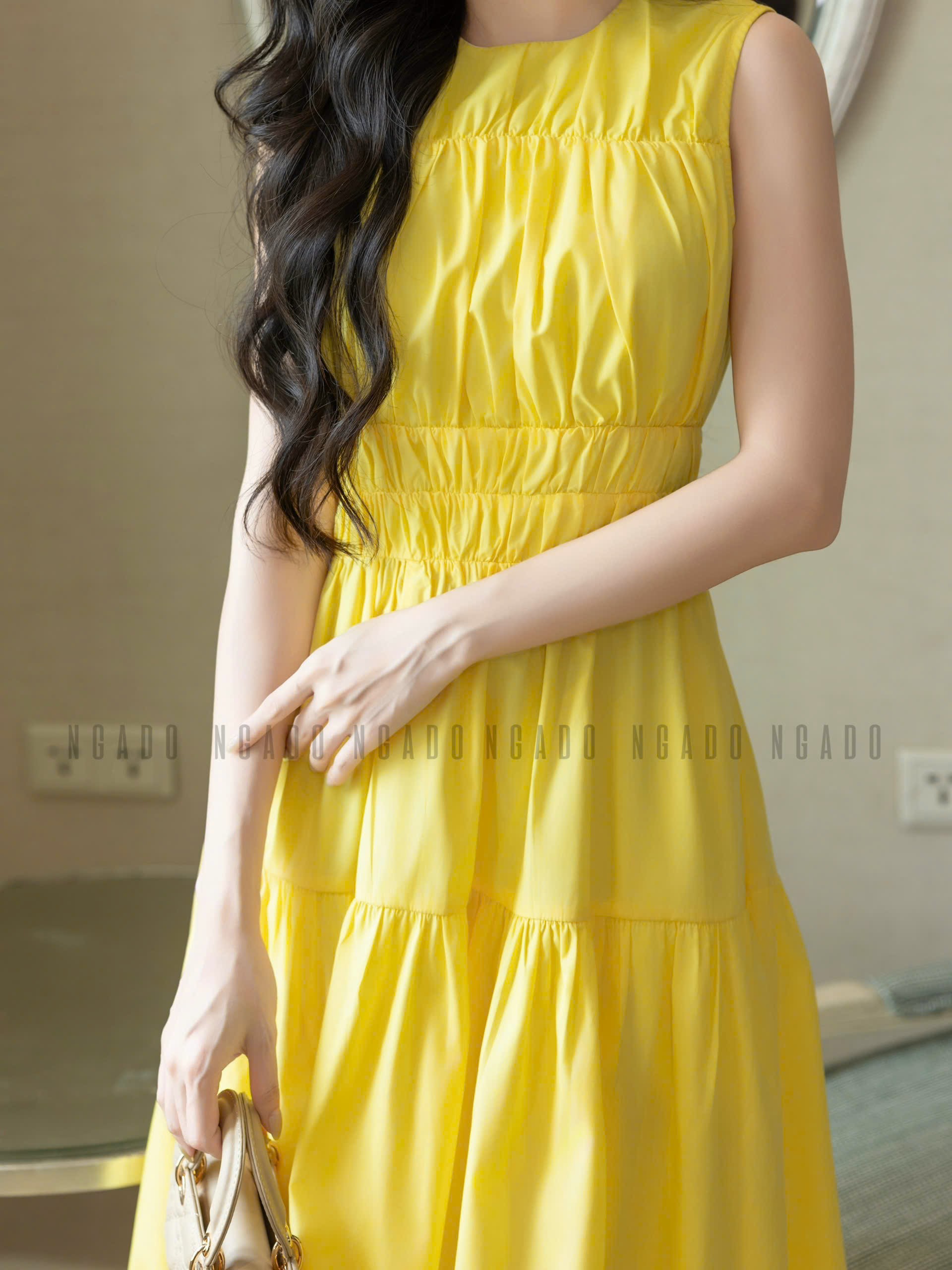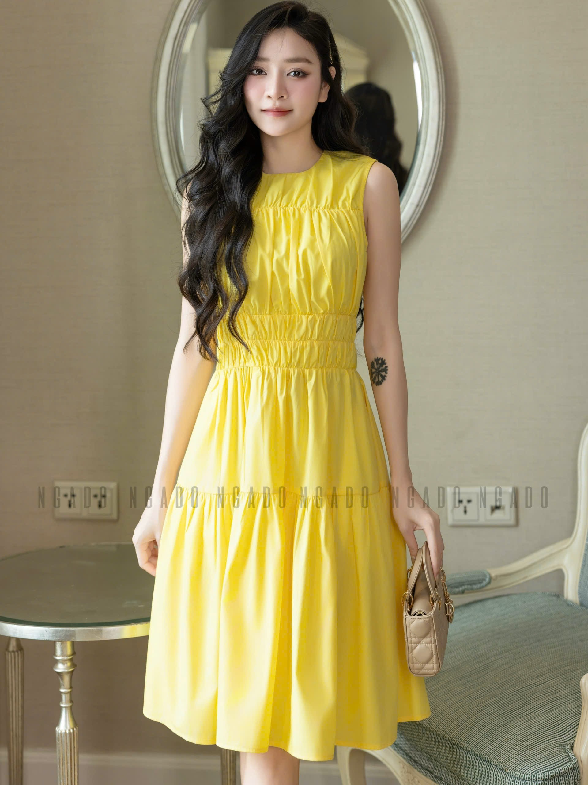 ✨Đầm vàng nhún eo NGADO , đầm dài , đầm sát nách , đầm kiểu Nữ