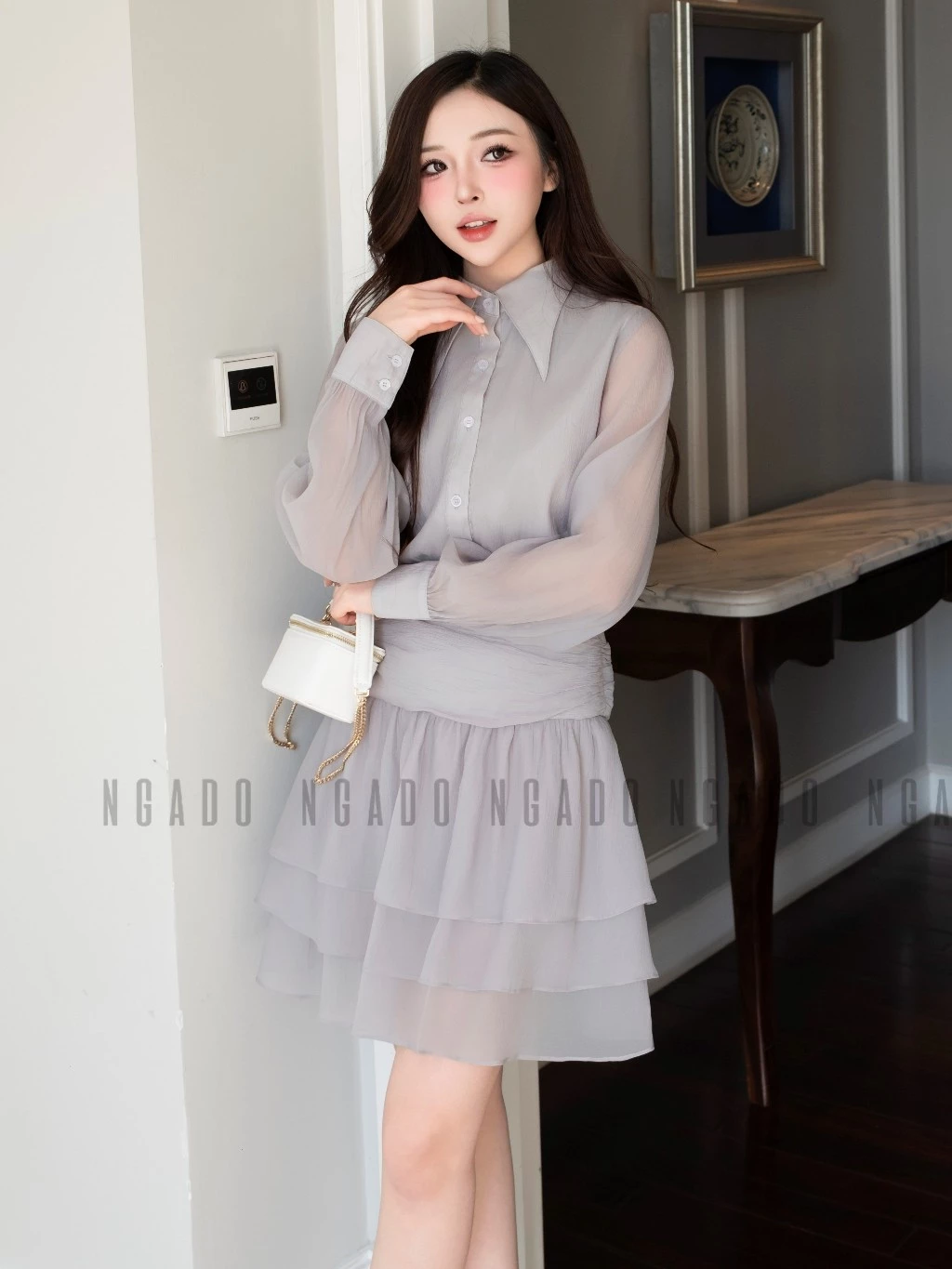 ✨Đầm xám phối voan NGADO , đầm sơ mi , đầm dài tay