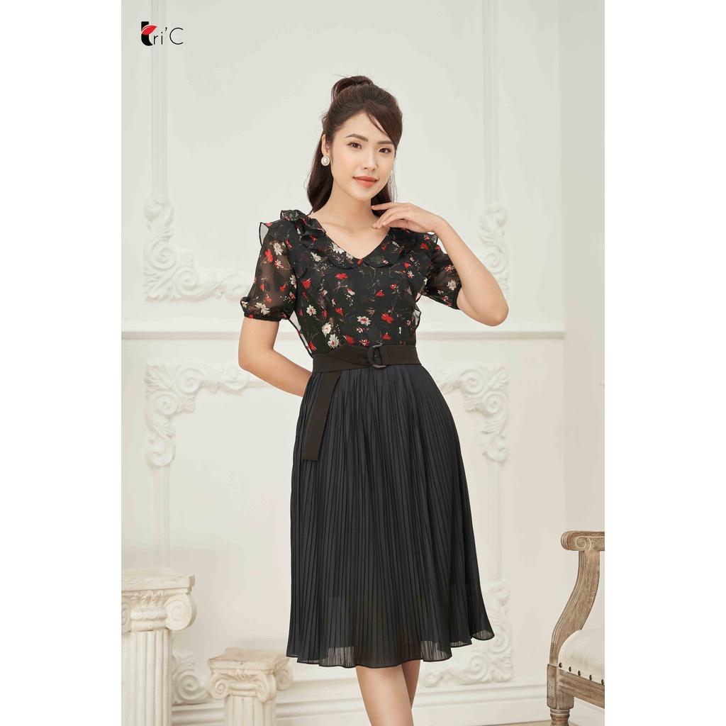 ✨Đầm xòe hoa đỏ, chân dập nhăn Tri'C Luxury A23521 Đen