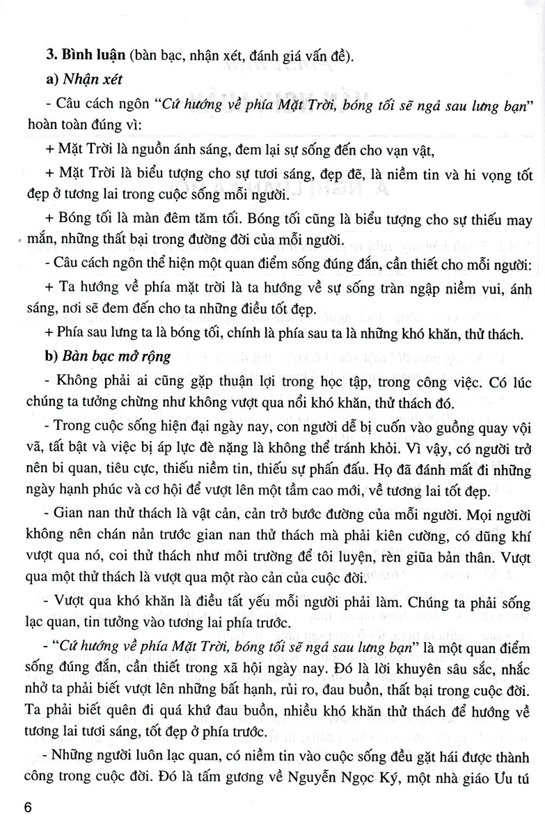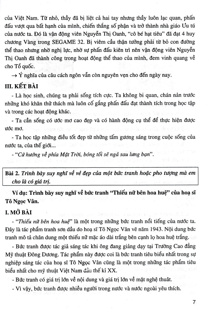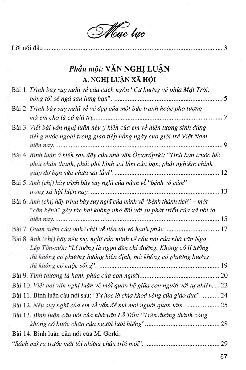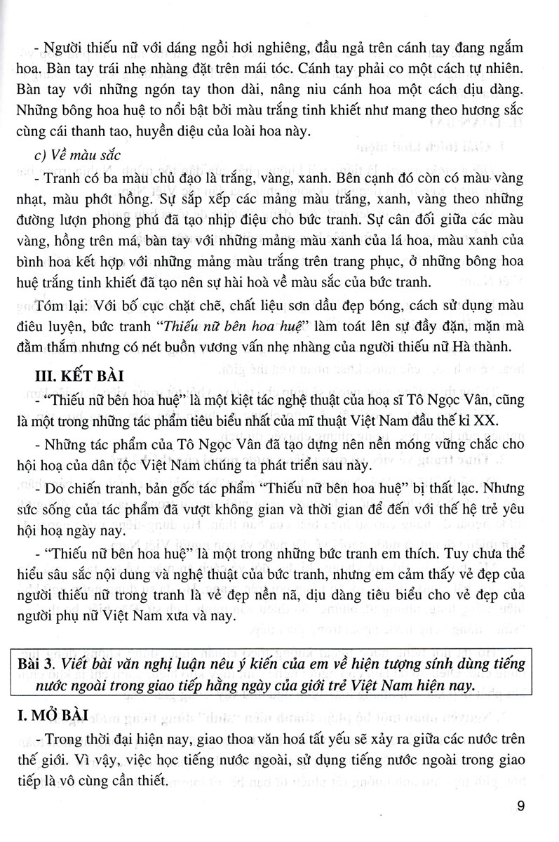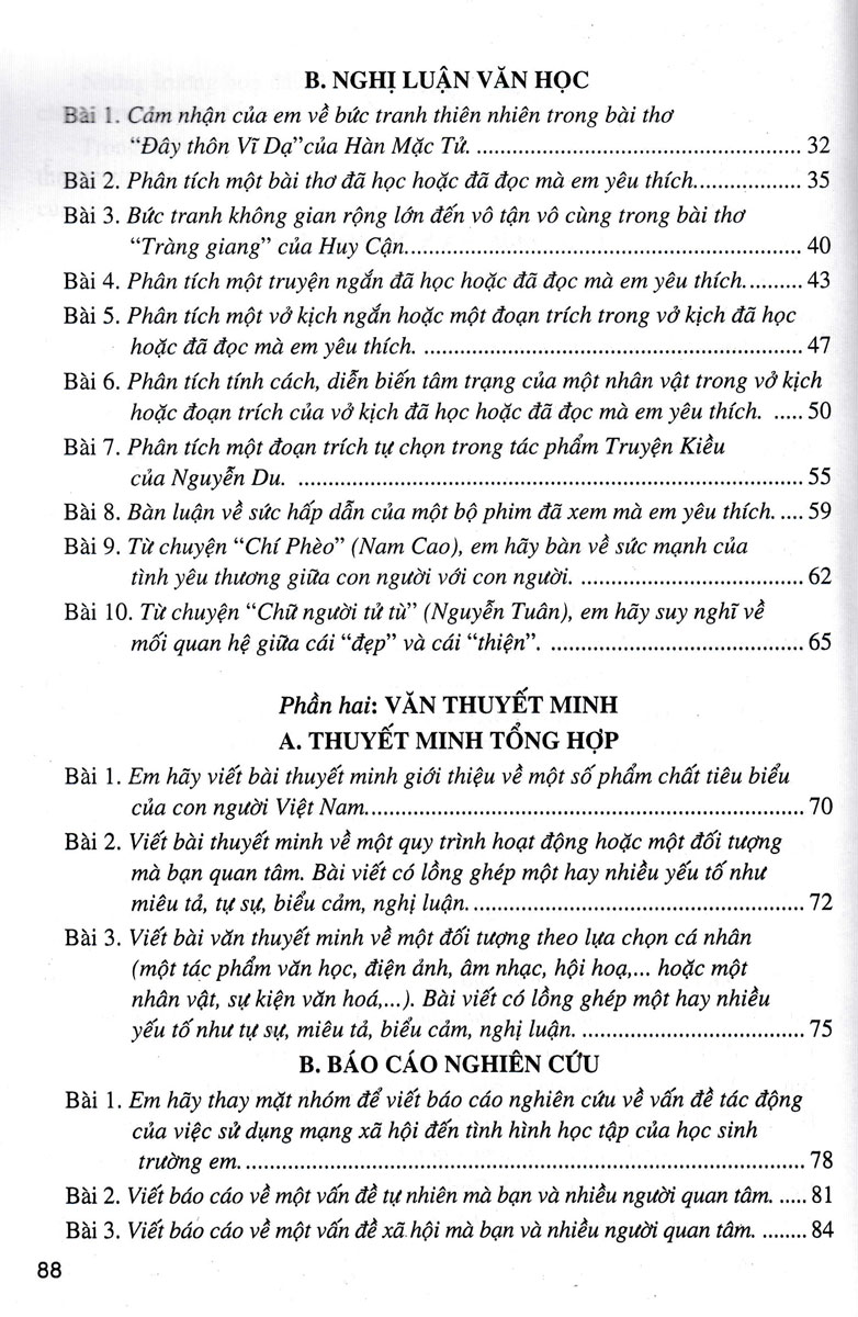 Nghị luận văn học: Tác giả đưa ra các đề bài nghị luận về một tác phẩm văn học hoặc một tác phẩm nghệ thuật (một bộ phim, bài hát, bức tranh, pho tượng). Tác giả làm sáng rõ giá trị nội dung và một số nét đặc sắc về nghệ thuật của tác phẩm.