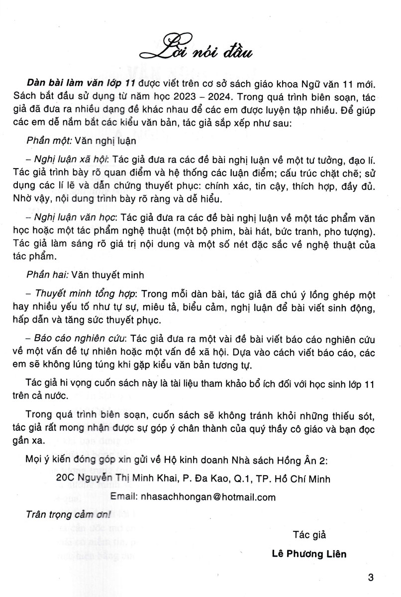 Dàn bài làm văn lớp 11 được viết trên cơ sở sách giáo khoa Ngữ văn 11 mới. Sách bắt đầu sử dụng từ năm học 2023 – 2024. Trong quá trình biên soạn, tác giả đã đưa ra nhiều dạng đề khác nhau để các em được luyện tập nhiều. Để giúp các em dễ nắm bắt các kiểu văn bản, tác giả sắp xếp như sau: