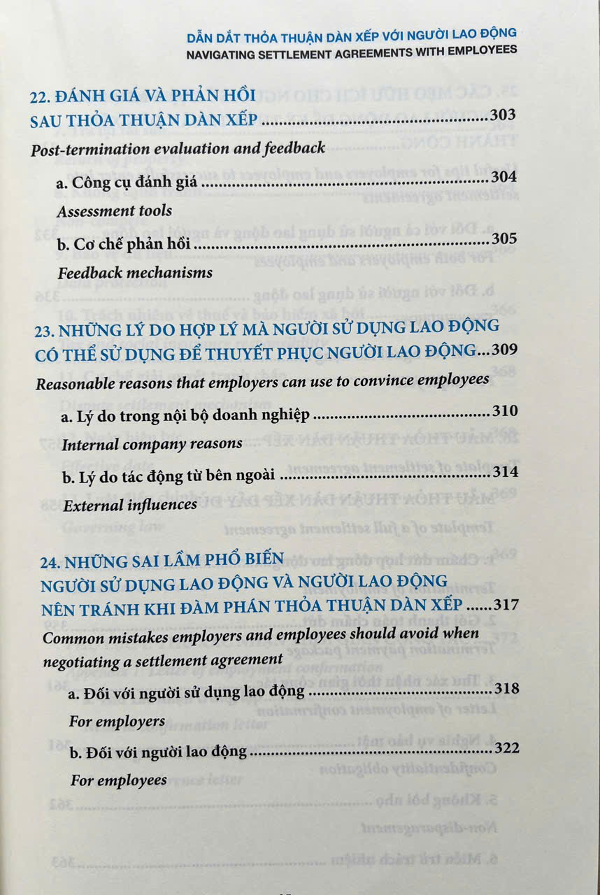Đây là cuốn sách thiết thực cho:  Chuyên viên Nhân sự - Người trực tiếp cân bằng lợi ích của doanh nghiệp và quan hệ lao động một cách hiệu quả.  Luật sư, Chuyên viên Pháp chế - Người đưa ra chiến lược dựa trên cơ sở pháp luật để tư vấn về lao động cho doanh nghiệp.  Quản lý doanh nghiệp - Người cần hiểu rõ bản chất, cơ sở pháp lý của thỏa thuận dàn xếp để đưa ra những quyết định hợp tình cho người lao động, hợp lý cho sự phát triển lâu dài của doanh nghiệp.  Những điểm chính trong sách mà người đọc không thể bỏ qua:  Tổng quan về các thỏa thuận dàn xếp lao động: giải thích khái niệm, mục đích và lợi ích cho cả người sử dụng lao động lẫn người lao động.    Các bước thực tiễn từ giai đoạn mời họp cho đến khi hoàn tất thỏa thuận.    Các yếu tố cần lưu ý về văn hóa, đạo đức, tâm lý trong quá trình đàm phán.    Mẫu điều khoản và các ví dụ tình huống điển hình để độc giả dễ dàng áp dụng vào thực tiễn.   Phân tích tác động tài chính và các phương pháp thiết lập ngân sách phù hợp cho doanh nghiệp.    Chia sẻ những lỗi thường gặp, các lời khuyên và gợi ý để thương lượng thành công