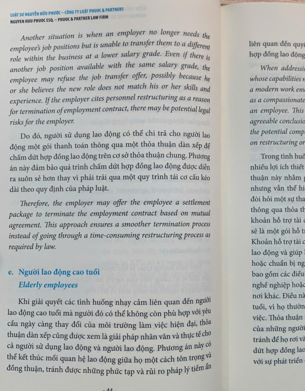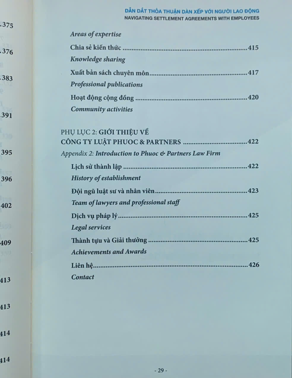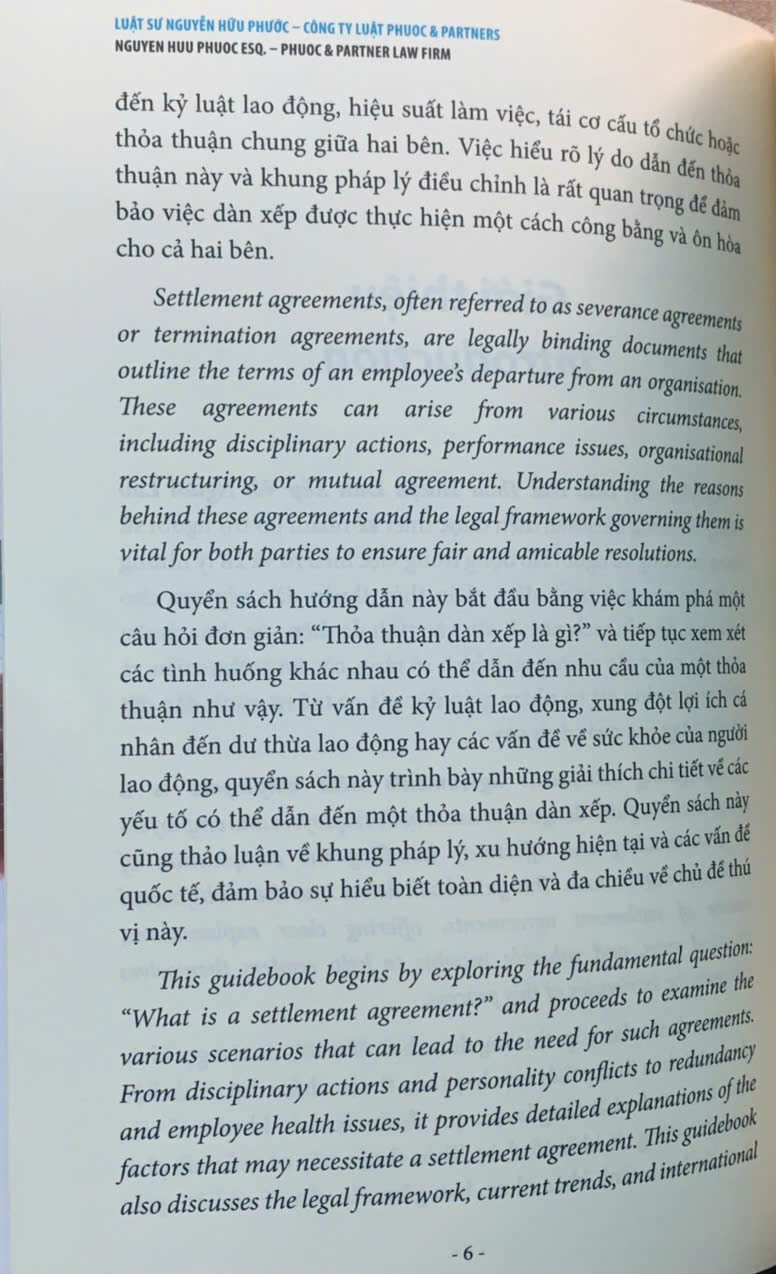 Sách - Dẫn Dắt Thỏa Thuận Dàn Xếp Với Người Lao Động - Navigating settlement agreements Tác giả: Luật sư Nguyễn Hữu Phước Ngày xuất bản: 5.2025 NXB: Tổng hợp TP.HCM Khổ: 15,5*23cm Số trang: 426 Giá bìa: 329.000 đồng Công ty phát hành: Nhà xuất bản Chính trị Quốc gia Sự thật Giới thiệu- Introduction Quyển sách Dẫn Dắt Thỏa Thuận Dàn Xếp Với Người Lao Động là hướng dẫn toàn diện được thiết kế nhằm hỗ trợ người sử dụng lao động và người lao động trong việc hiểu rõ và xử lý những phức tạp của quá trình đàm phán thỏa thuận dàn xếp sao cho hiệu quả. Quyển sách này đi sâu vào tính đa diện của thỏa thuận dàn xếp, cung cấp những giải thích rõ ràng, các bước thực tiễn và những góc nhìn giá trị nhằm giúp độc giả có thể tự mình dẫn dắt sự phức tạp của quá trình này. Navigating settlement agreements with employees is a comprehensive guide designed to assist both employers and employees in understanding and effectively handling the complexities of settlement negotiations. This guidebook delves into the multifaceted nature of settlement agreements, offering clear explanations, practical steps, and valuable insights to help readers themselves navigate the intricacies of this process. Thỏa thuận dàn xếp, thường được biết đến với các tên gọi khác nhau như thỏa thuận thôi việc hay thỏa thuận chấm dứt, là tài liệu pháp lý có tính chất ràng buộc, quy định các điều khoản về việc người lao động rời khỏi tổ chức. Thỏa thuận này có thể xuất phát từ nhiều hoàn cảnh khác nhau, bao gồm các vấn đề có liên quan đến kỷ luật lao động, hiệu suất làm việc, tái cơ cấu tổ chức hoặc thỏa thuận chung giữa hai bên. Việc hiểu rõ lý do dẫn đến thỏa thuận này và khung pháp lý điều chỉnh là rất quan trọng để đảm bảo việc dàn xếp được thực hiện một cách công bằng và ôn hòa cho cả hai bên. Settlement agreements, often referred to as severance agreements or termination agreements, are legally binding documents that outline the terms of an employee's departure from an organisation. These agreements can arise from various circumstances, including disciplinary actions, performance issues, organisational restructuring, or mutual agreement. Understanding the reasons behind these agreements and the legal framework governing them is vital for both parties to ensure fair and amicable resolutions. Quyển sách hướng dẫn này bắt đầu bằng việc khám phá một câu hỏi đơn giản: “Thỏa thuận dàn xếp là gì?” và tiếp tục xem xét các tình huống khác nhau có thể dẫn đến nhu cầu của một thỏa thuận như vậy. Từ vấn đề kỷ luật lao động, xung đột lợi ích cá nhân đến dư thừa lao động hay các vấn đề về sức khỏe của người lao động, quyển sách này trình bày những giải thích chi tiết về các yếu tố có thể dẫn đến một thỏa thuận dàn xếp. Quyển sách này cũng thảo luận về khung pháp lý, xu hướng hiện tại và các vấn đề quốc tế, đảm bảo sự hiểu biết toàn diện và đa chiều về chủ đề thú vị này. This guidebook begins by exploring the fundamental question: "What is a settlement agreement?" and proceeds to examine the various scenarios that can lead to the need for such agreements. From disciplinary actions and personality conflicts to redundancy and employee health issues, it provides detailed explanations of the factors that may necessitate a settlement agreement. This guidebook also discusses the legal framework, current trends, and international considerations, ensuring a comprehensive and multidimensional understanding of this interesting topic. Một trong những phần quan trọng của quyển sách hướng dẫn này là tập trung vào lợi ích của thỏa thuận dàn xếp đối với cả người sử dụng lao động và người lao động. Bằng việc nêu bật những lợi ích như tiết kiệm chi phí, tuân thủ pháp luật và duy trì mối quan hệ tích cực, quyển sách hướng dẫn này nhấn mạnh đến tầm quan trọng của thỏa thuận này trong việc thúc đẩy môi trường làm việc công bằng và tôn trọng lẫn nhau. One of the key sections of this guidebook focuses on the benefits of settlement agreements for both employers and employees. By highlighting the advantages, such as cost savings, legal compliance, and maintaining positive relationships, it aims to emphasize the importance of these agreements in fostering a fair and respectful workplace environment. Ngoài những kiến thức lý thuyết, quyển sách hướng dẫn này còn giới thiệu các bước thực tiễn trong việc đàm phán thỏa thuận dàn xếp. Quyển sách hướng dẫn này đưa ra phương pháp tiếp cận theo từng bước, từ lời mời họp ban đầu đến hoàn tất thỏa thuận, đảm bảo độc giả sẽ được trang bị đầy đủ để có thể xử lý qua từng giai đoạn của quá trình này. Quyển sách hướng dẫn này cũng đi sâu vào nội dung của thỏa thuận dàn xếp, nêu rõ các thành phần thiết yếu và thảo luận về việc làm thế nào để một thỏa thuận dàn xếp được xem là công bằng cho các bên. Bên cạnh đó, quyển sách hướng dẫn này còn đưa ra một số lý do hợp lý để người sử dụng lao động thuyết phục người lao động đồng ý với đề nghị dàn xếp của mình. Hơn thế nữa, quyển sách