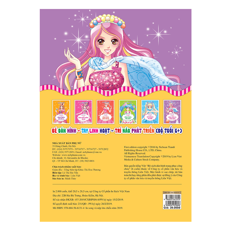 Bộ sách "Dán hình trang phục công chúa" gồm 6 tập sách in màu trên giấy dày, đẹp, có nhiều tranh vẽ và đề can dán hình sặc sỡ, sắc nét, giúp cho đôi tay các bé thêm linh hoạt, khéo léo, nhận biết được các hình, để bóc dán cho đúng chỗ. Ngoài ra sách được đóng quyển sẽ giúp các bé sau khi dán hình, hoàn thiện bức tranh có thể lưu giữ, sưu tầm thành bộ sưu tập, không chỉ sử dụng một lần như các sticker thông thường. Gồm 6 cuốn: Công chúa tóc mây, Công chúa hồng ấm áp, Công chúa sô cô la, Công chúa phép thuật, Nàng tiên cá lãng mạn, Nữ hoàng dạ hội .