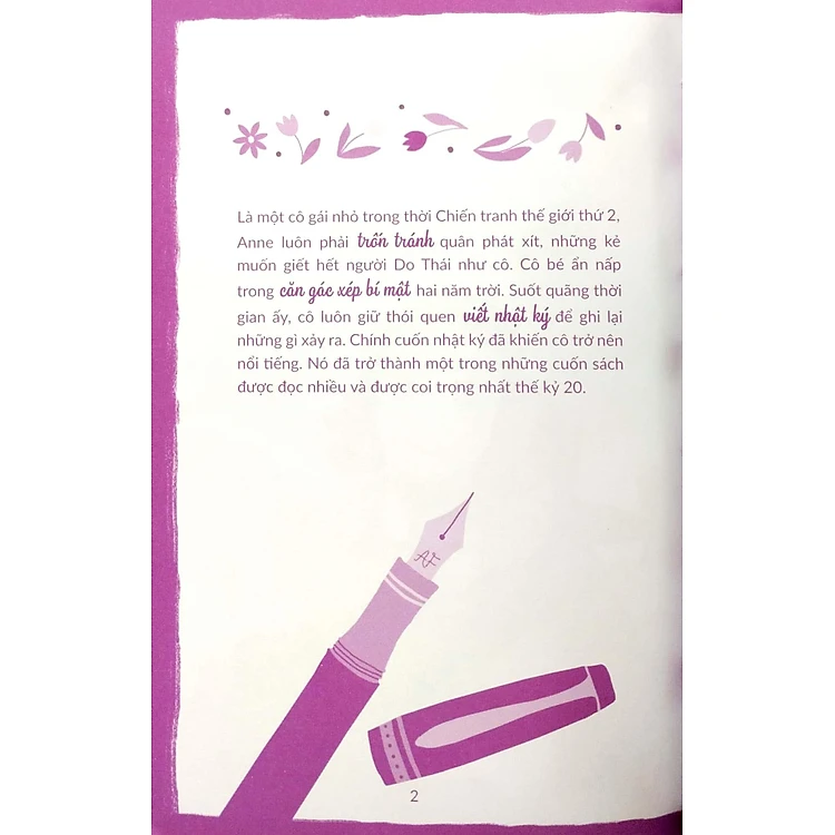 • Cuốn sách cung cấp một cái nhìn sâu sắc về cuộc đời của Anne Frank, từ khi cô còn là một cô bé sống ở Hà Lan, đến thời điểm gia đình cô phải lẩn trốn trong một căn gác xép để tránh sự truy lùng của phát xít Đức. Cuốn nhật ký của Anne Frank không chỉ là một tài liệu lịch sử quan trọng mà còn là một tác phẩm văn học tuyệt vời, phản ánh tâm tư và cảm xúc của một cô gái tuổi teen trong bối cảnh chiến tranh và đàn áp. Sách không chỉ kể lại những sự kiện trong nhật ký của Anne mà còn đưa ra những phân tích và bối cảnh lịch sử xung quanh câu chuyện của cô.