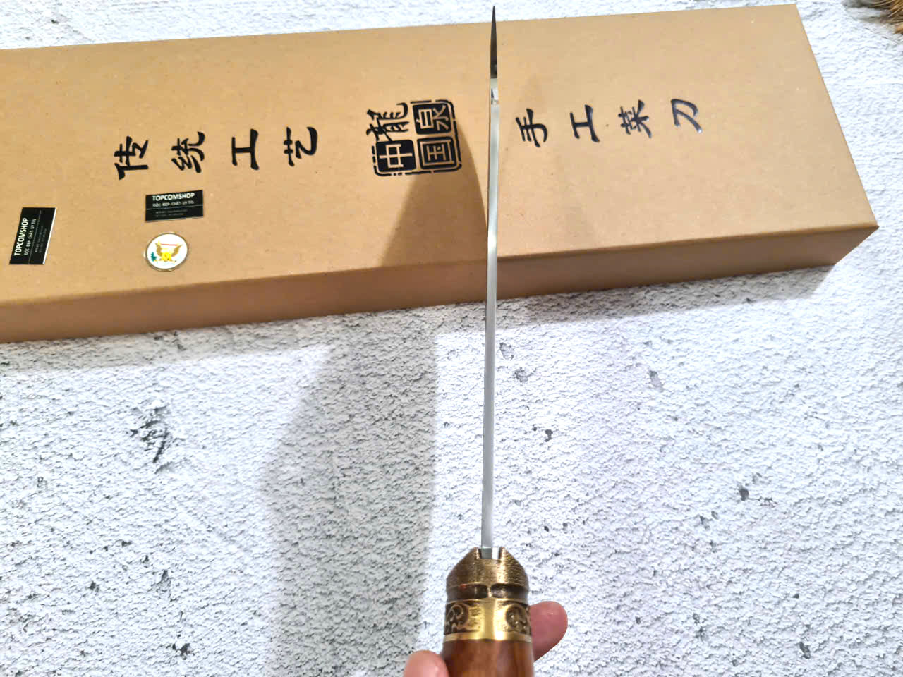 Chất liệu tay cầm: gỗ CẨM LAI, khâu và chuôi cuối dao bằng đồng thau
