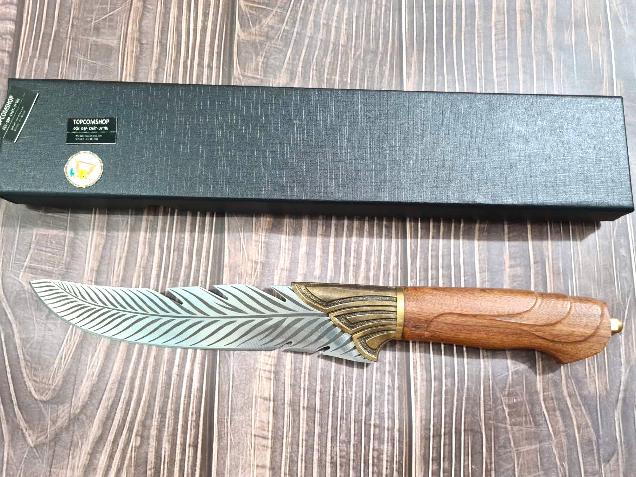 THÔNG TIN SẢN PHẨM TỔNG DÀI : 33cm, LƯỠI: 16.5cm,CÁN: 12cm ,RỘNG : 3,6cm, dày: 2.5mm, CHẤT liệu lưỡi: 7Cr17MOV (thép 7 crom 17 molypden vanadi) Chất liệu CÁN: gỗ cẩm lai, Các phụ kiện ( khâu ) : đồng thau NẶNG : 3 lạng