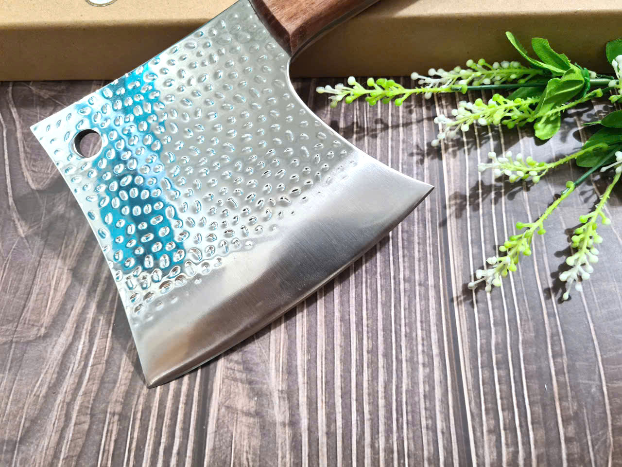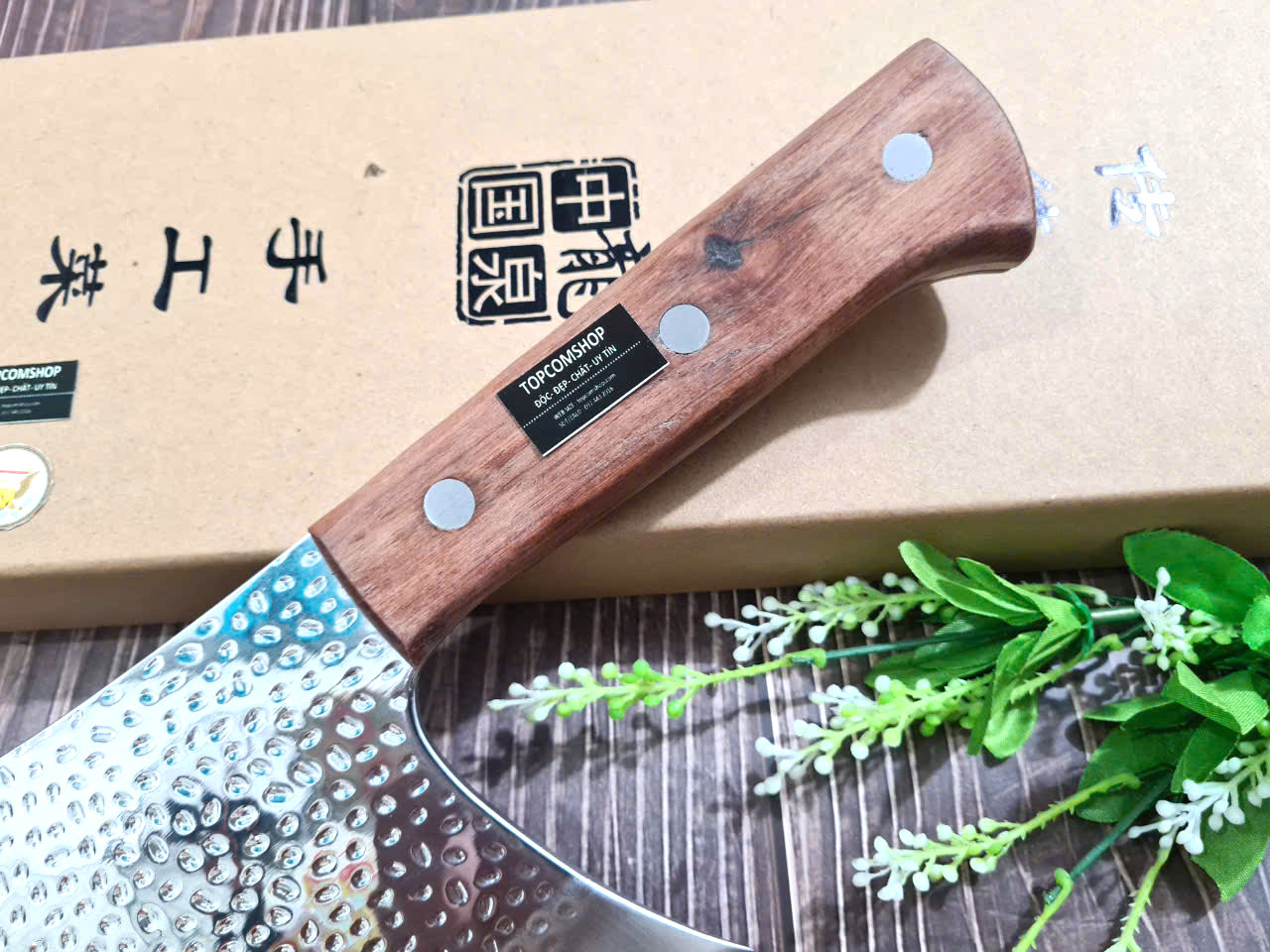 - Chức năng: Chặt xương ống, chân giò, trâu bò - Kích thước: Lưỡi: 22cm, cán: 10cm, rộng: 10cm, dầy: 5ly, trọng lượng: 800g - Cán : Gỗ mun, Khâu đồng đỏ , chốt đinh