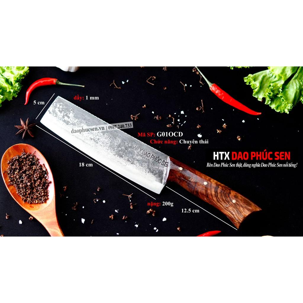 Dao Phúc Sen Dao Thái 18 Cán Ốp Cẩm ( G01OCD ) - Kích thước: lưỡi: 18cm, cán: 12cm, rộng: 4,5cm, dầy: 0,1, trọng lượng: 150g - Chức năng: sử dụng chuyên thái thịt ,cá,