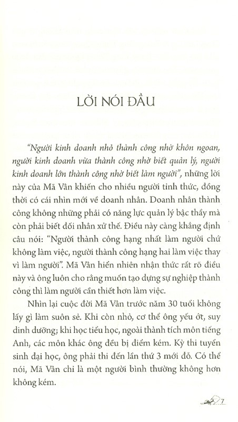 - Giới thiệu Thành công trong lần đầu phát hành cổ phiếu ra công chúng trên thị trường chứng khoán New York, Mã Vân - ông chủ Tập đoàn Alibaba - đã trở thành tỉ phú giàu nhất Trung Quốc. Hẳn bạn tự hỏi tại sao một người học hành không mấy xuất sắc như ông lại có thể leo đến đỉnh vinh quang? Câu trả lời thỏa đáng sẽ đến với bạn khi lần giở từng trang Đạo xử thế của Mã Vân (Jack Ma). Cuốn sách lần đầu tiên tiết lộ 11 nguyên tắc xử thế quan trọng trong hơn 20 năm kinh doanh của Mã Vân. Chính nhờ giữ vững các nguyên tắc này, ông đã vượt qua những thử thách tưởng chừng không thể với người bình thường. Trích dẫn các câu nói bất hủ của Mã Vân đồng thời phân tích tình huống ông áp dụng nguyên tắc, sách mang đến cho bạn nhiều gợi mở thú vị để vận dụng trên hành trình khởi nghiệp của chính mình.