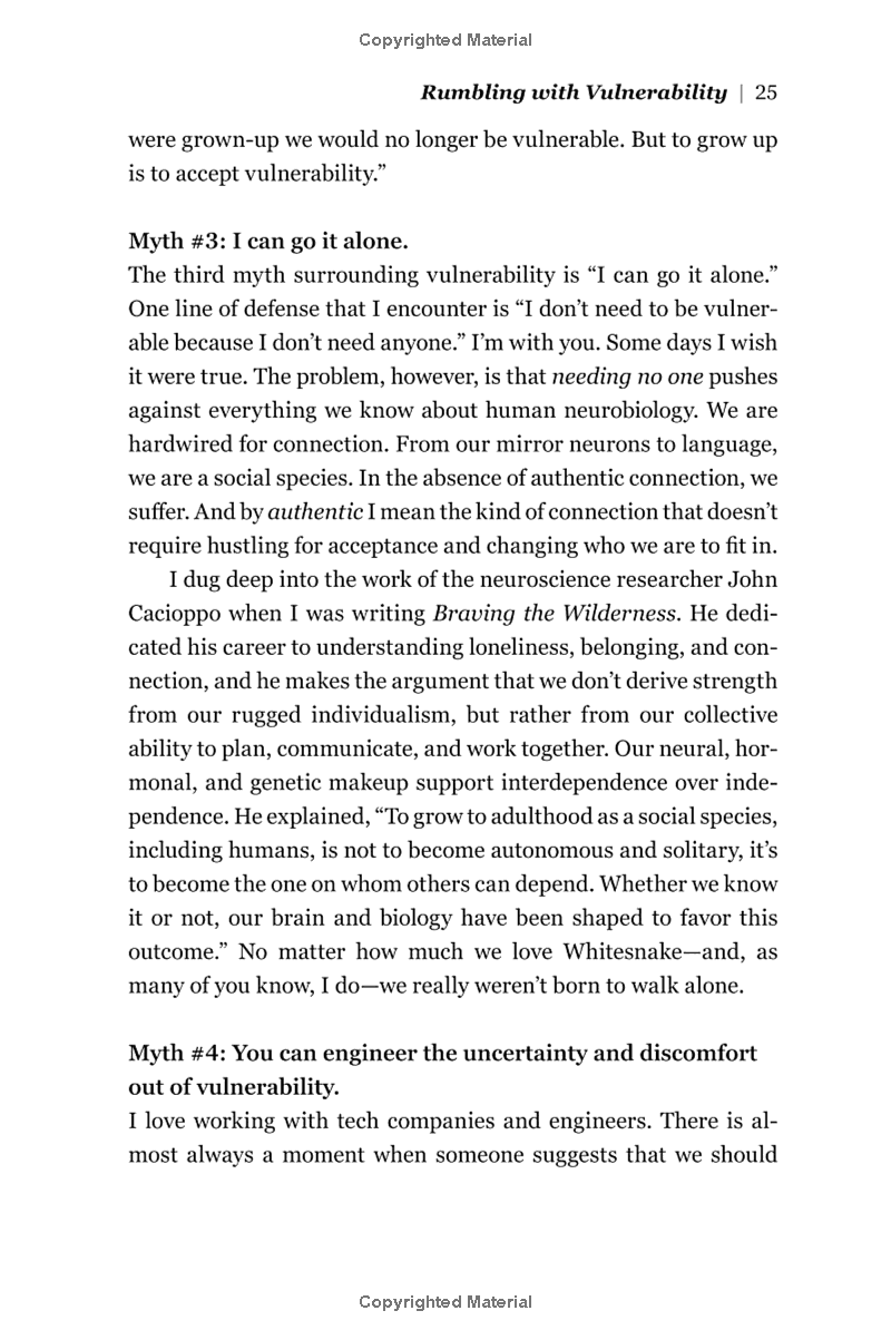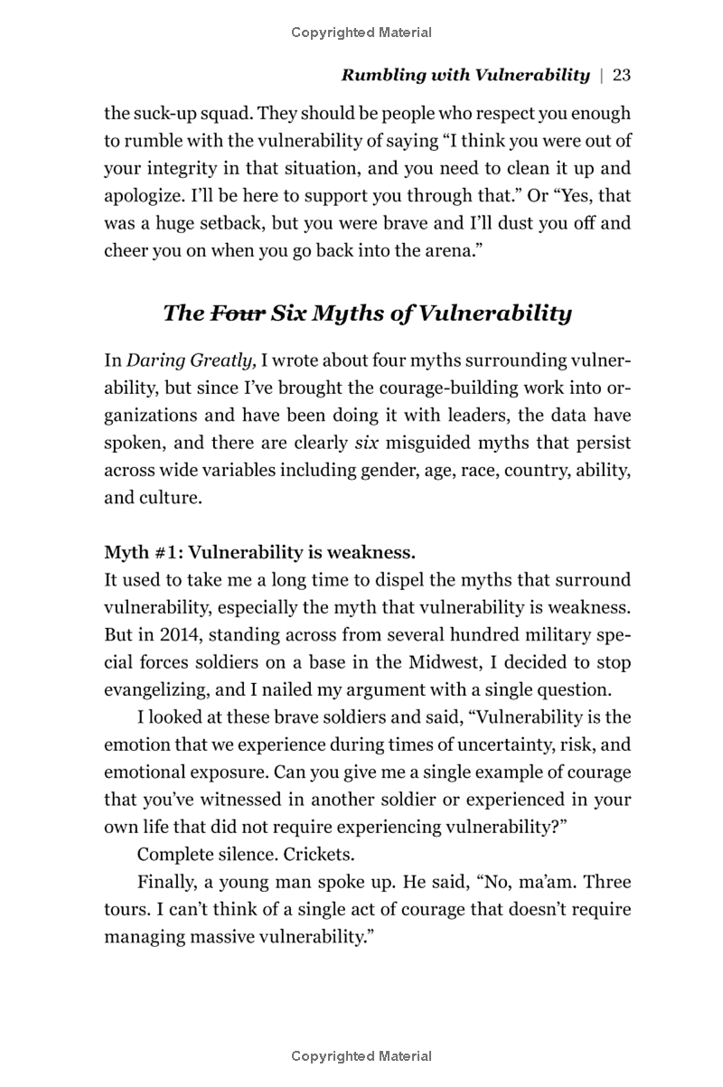 Brené writes, ‘One of the most important findings of my career is that courage can be taught, developed and measured. Courage is a collection of four skill sets supported by twenty-eight behaviours. All it requires is a commitment to doing bold work, having tough conversations and showing up with our whole hearts. Easy? No. Choosing courage over comfort is not easy. Worth it? Always. We want to be brave with our lives and work. It's why we're here.’