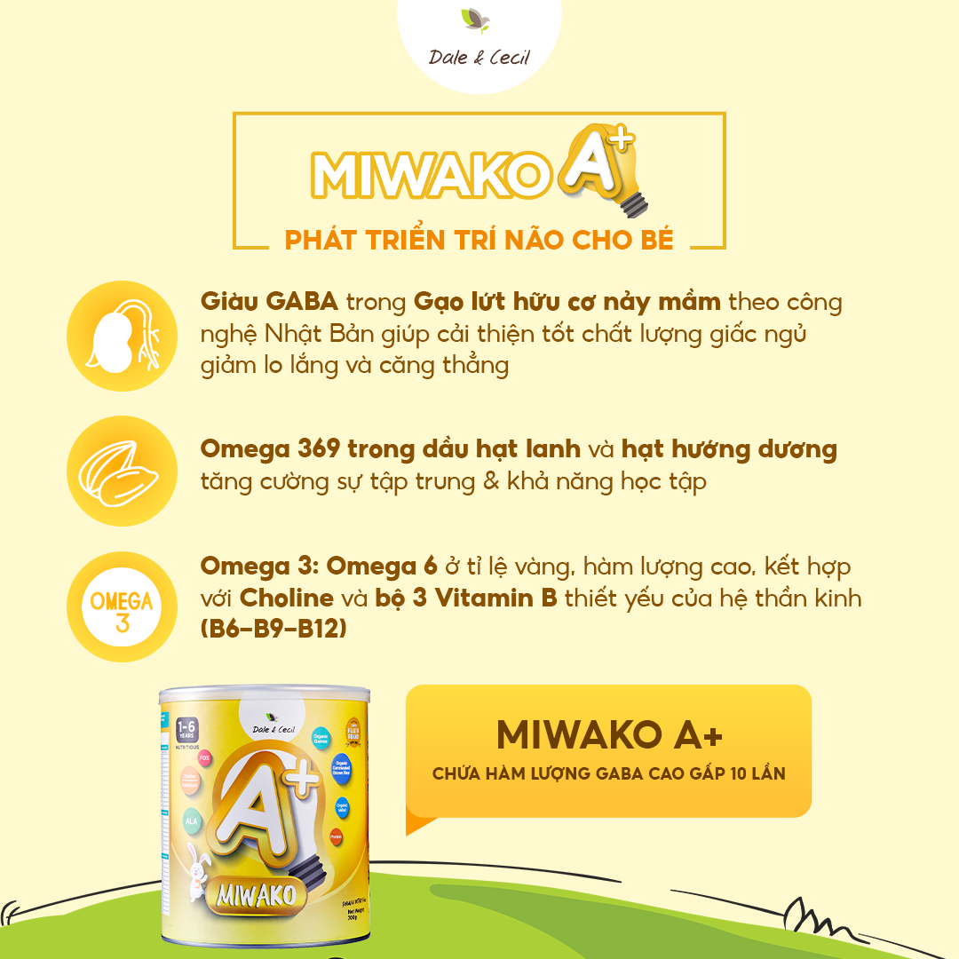 • GABA từ mầm gạo lứt hữu cơ làm dịu căng thẳng thần kinh một cách tự nhiên. Miwako A+ cung cấp gấp 10 lần hàm lượng GABA từ mầm gạo lứt hữu cơ so với cùng 1 thể tích sữa gạo thường. Giúp não bộ tối ưu khả năng học tập, làm dịu căng thẳng một cách tự nhiên, trẻ ngủ ngoan và giảm bùng nổ tâm lý.
