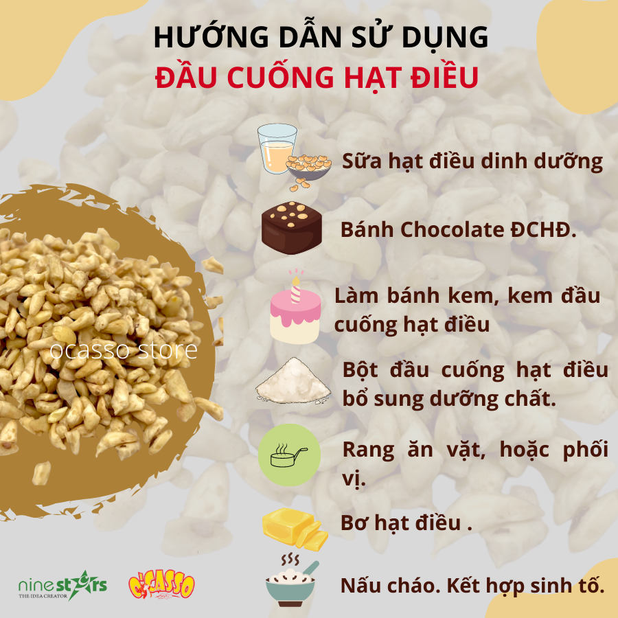 Cách sử dụng Đầu Cuống Hạt Điều: Với hàm lượng dinh dưỡng cao, đầu cuống hạt điều được các tập đoàn lớn sản xuất sữa hạt tại Mỹ và Châu Âu đang sử dụng phần đầu cuống làm nguyên liệu để sản xuất bánh kẹo, sữa bột hoặc sữa nước cung cấp thức uống bổ sung. Hiện nay, các sản phẩm Đầu Cuống Hạt Điều được Nine Stars sản xuất và bán trên thị trường với đa dạng mẩu mã và trọng lượng, đáp ứng nhu cầu sử dụng khách lẻ, và cung cấp cho các nhà máy, xí nghiệp lớn.