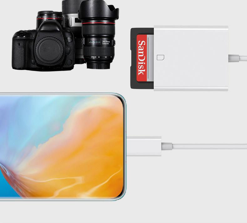 1. Input: USB-C 3.0 male 2. Output: 1×SD card slot, 1×TF card slot, 1× USB-A 2.0 3. USB-A standard: USB 2.0 standard can theoretically transfer data at a very high 480Mbps 4. Supported memory cards: