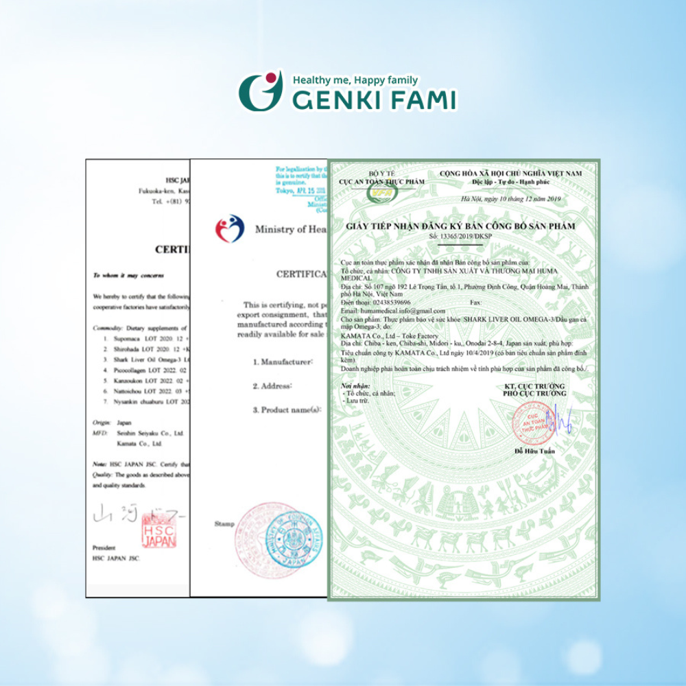- Chứng nhận công bố sản phẩm của Bộ Y tế số: 13365/2019/ĐKSP. NGUYÊN LIỆU: Dầu cá tinh chế giàu DHA・EPA, Dầu gan cá mập, gelatin, glycerin, Astaxanthin. CÔNG DỤNG: