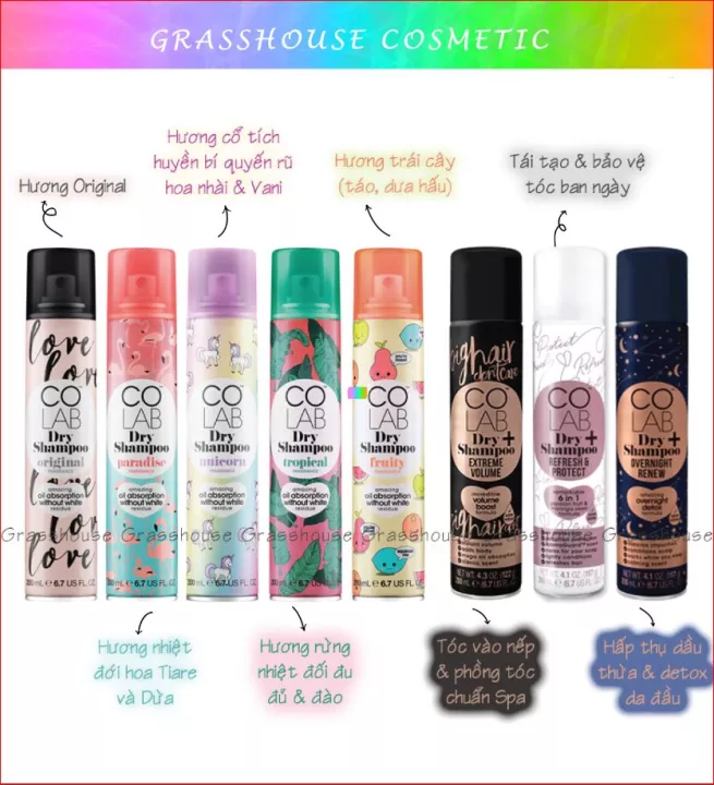 Dầu gội khô COLAB đến từ Anh Quốc giúp giải cứu những mái tóc bết, nhiều dầu với khả năng hút dầu và bụi bẩn nhanh chóng, bồng bềnh, trả lại mái tóc sạch sẽ và tươi mới chỉ sau vài giây sau khi xịt.