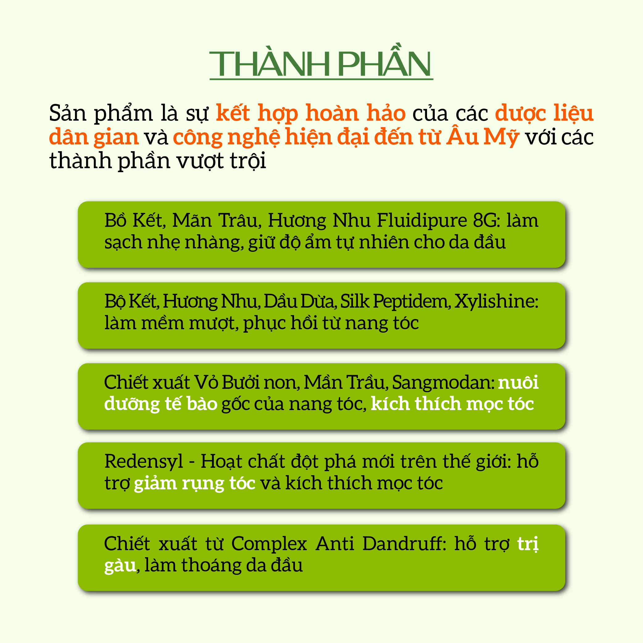• Chiết xuất từ Vỏ Bưởi non, Mần Trầu, Sangmodan (chiết xuất tổng hợp của I loại thảo mộc quý hiếm) giúp nuôi dưỡng tế bào gốc của nang tóc và kích thích mọc tóc.