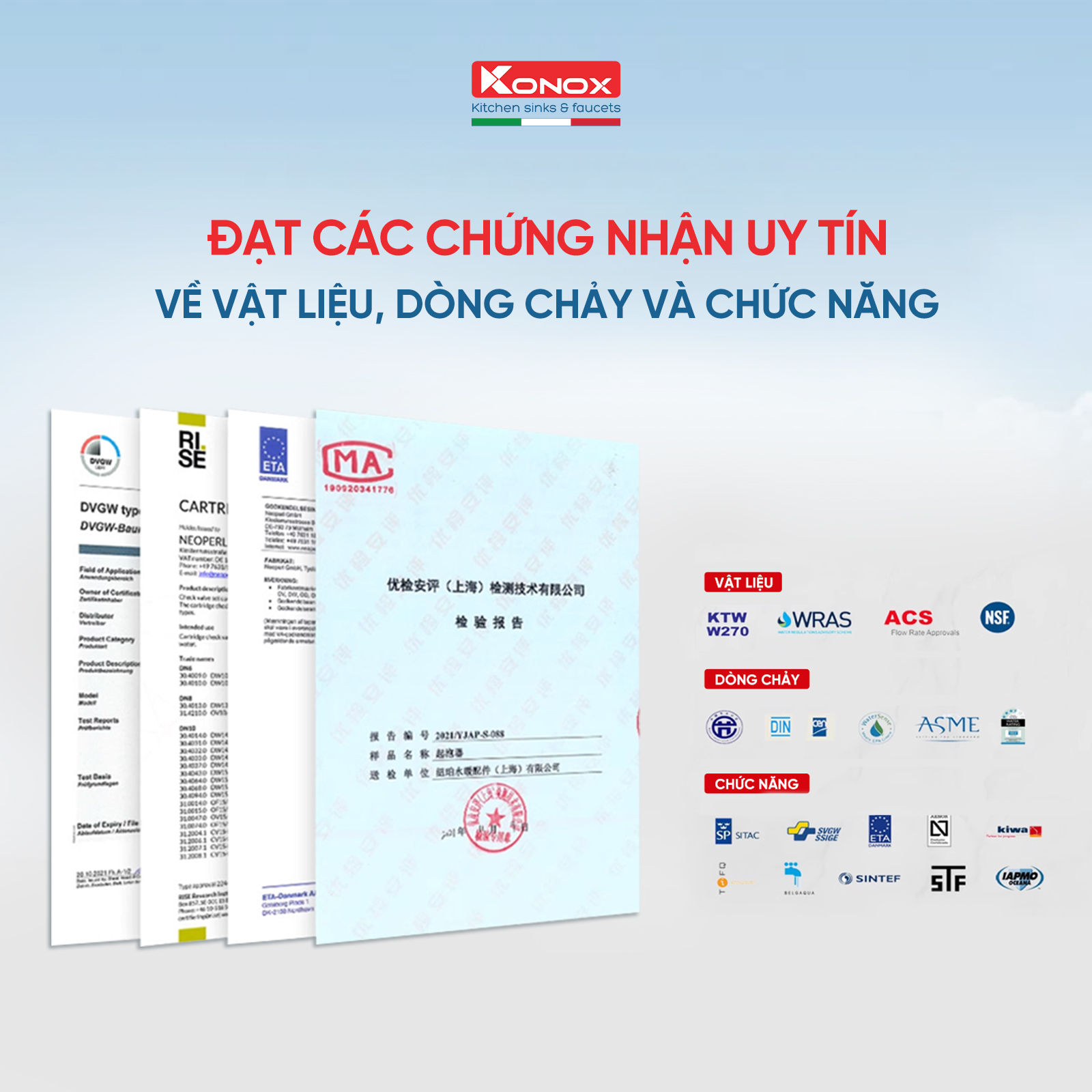 - Sử dụng chất liệu đồng đạt tiêu chuẩn CW617N siêu bền, tốt cho sức khỏe, đạt tiêu chuẩn NSF và đạt các tiêu chuẩn về an toàn dòng nước sử dụng trong ăn uống